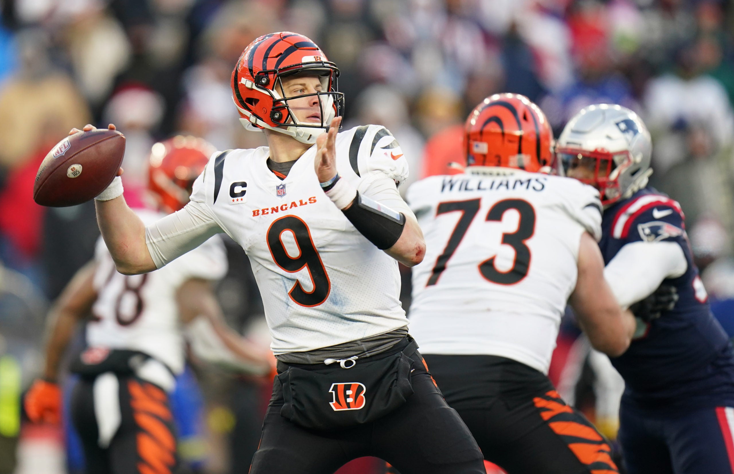 • Jan 8, 2023; Cincinnati, Ohio, USA;  Cincinnati Bengals quarterback Joe Burrow (9) audibles at the line during the second quarter against the Baltimore Ravens at Paycor Stadium. Mandatory Credit: Joseph Maiorana-USA TODAY Sports