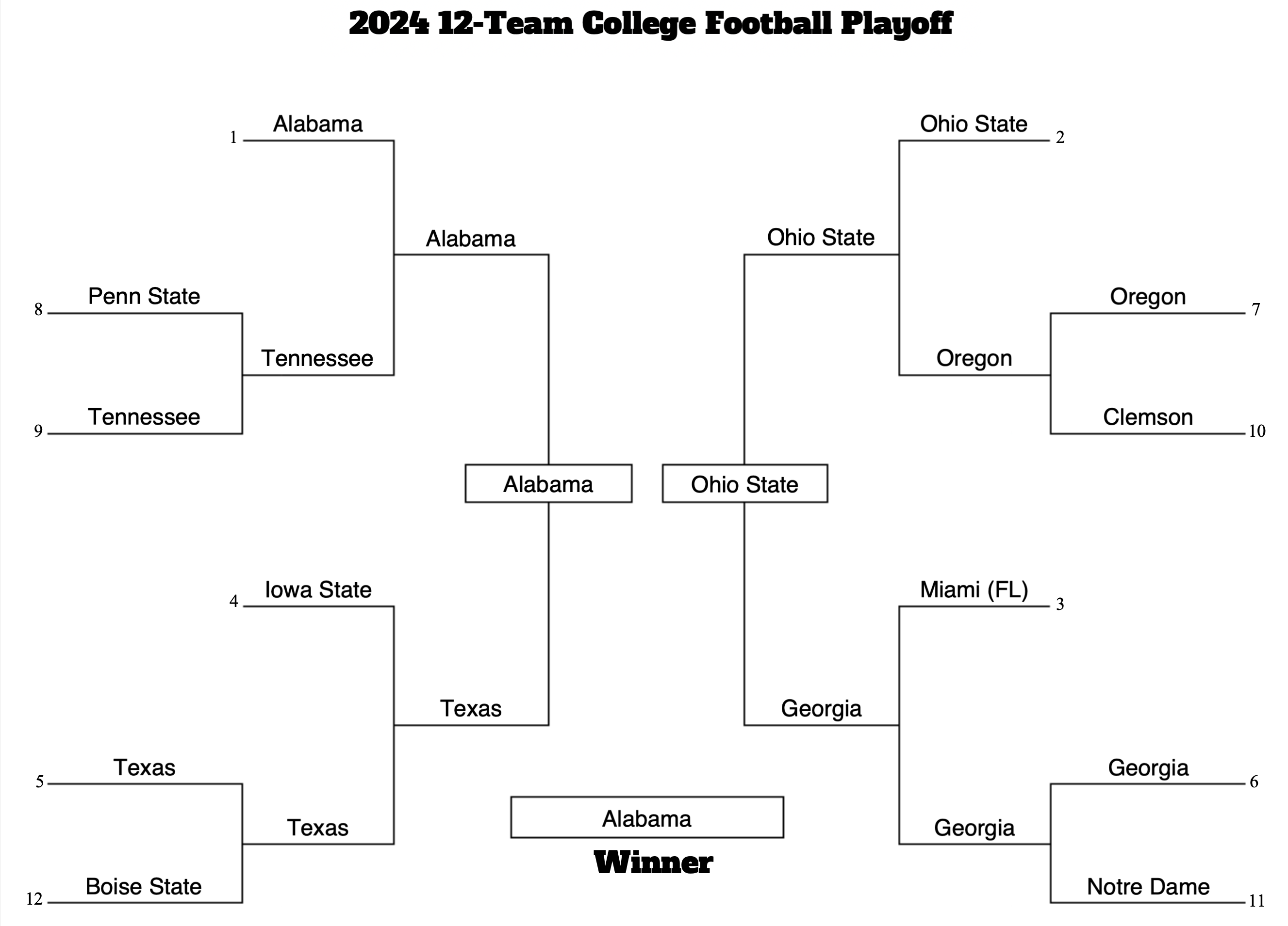As of today, this game is essentially a draw on paper, but Alabama's performance against their strength of schedule to date gives them just a slight edge. It would be glorious to see this epic matchup of two great brands go to multiple overtimes in the championship. Jalen Milroe's dual threat mobility likely proves to be a useful edge when the game is on the line and the Crimson Tide wins it all. That shouldn't be surprising since Kalen DeBoer just took Washington to the championship game a year ago.