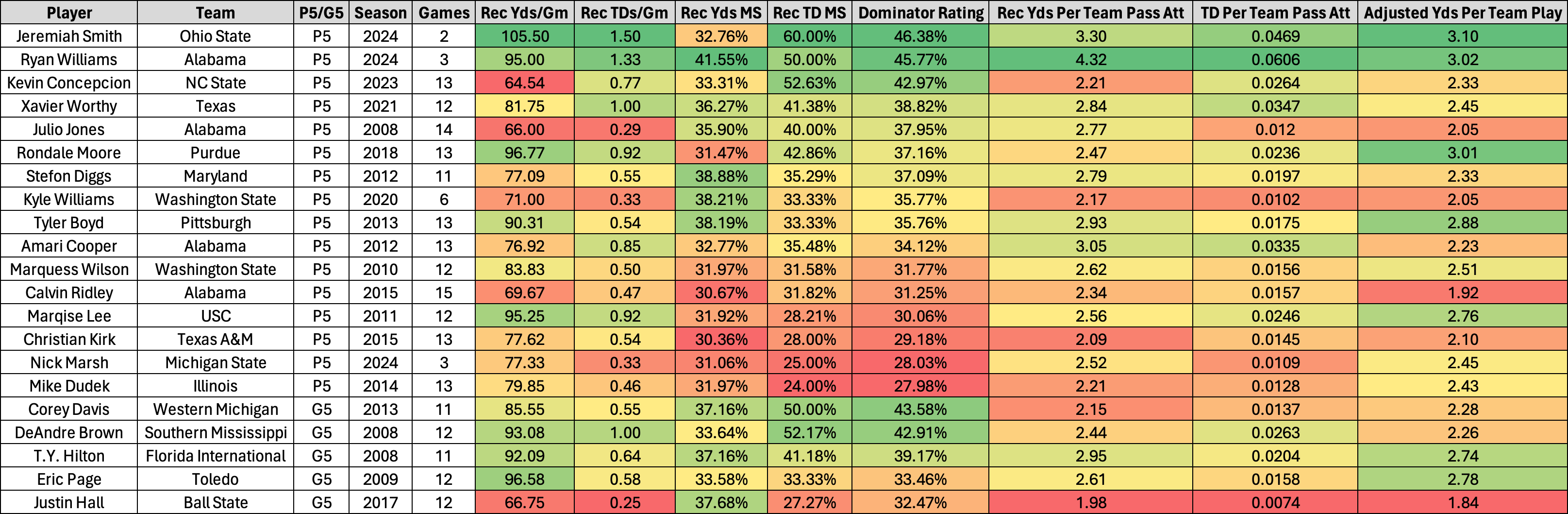This image shows every true freshman wide receiver season since 2005 where the player eclipsed 30% of their team's receiving yards (receiving yard market share). It's sorted by dominator rating. And as you can see, both Jeremiah Smith and Ryan Williams find themselves at the very top of the list.