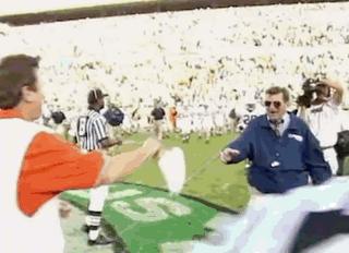 When the two coaches met at midfield for the post-game handshake, Spurrier famously put his Gators visor on Paterno's head. Paterno quickly removed the hat as the two coaches shared a laugh.