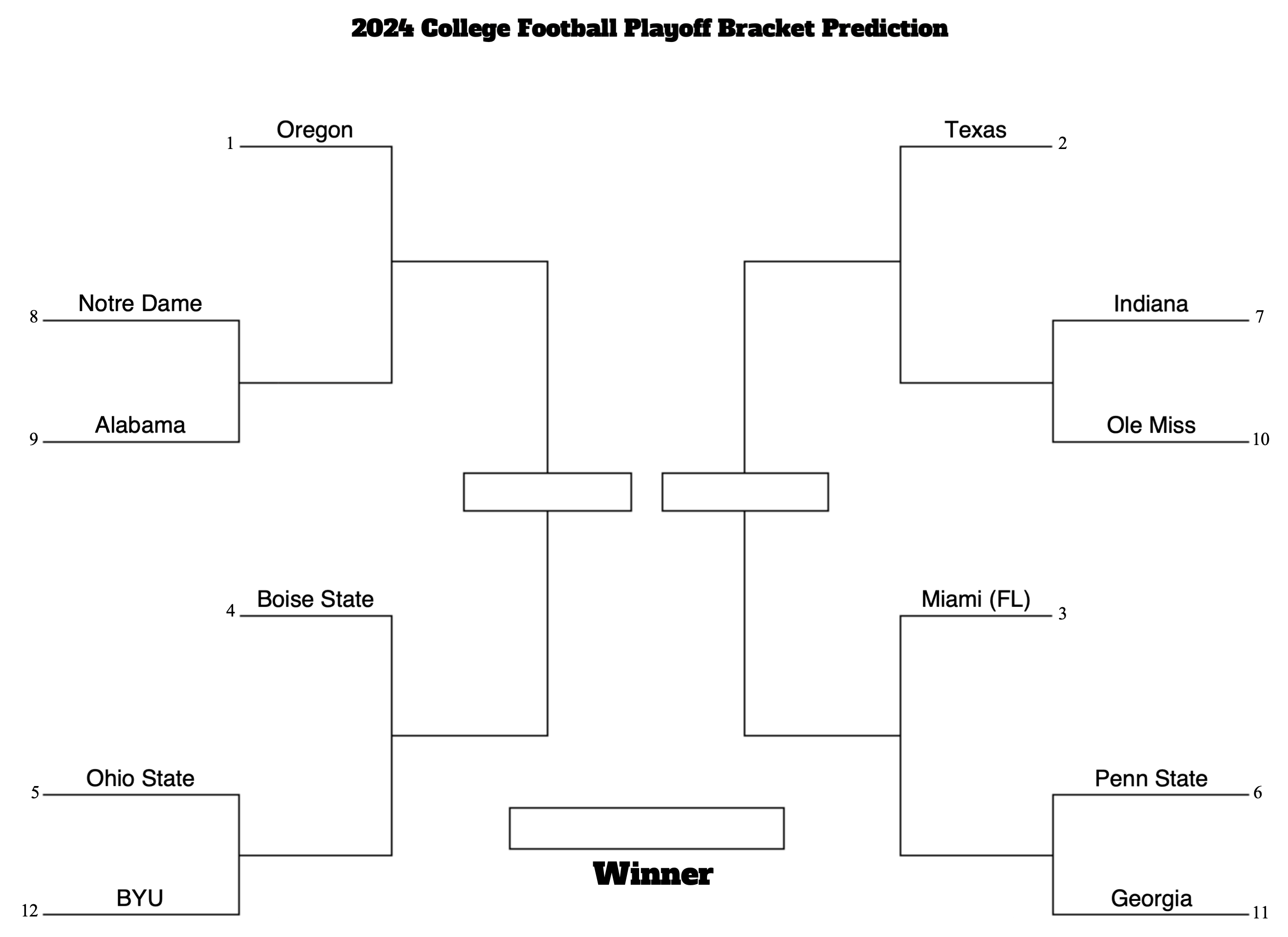 Ohio State, Penn State, Indiana, and Notre Dame would all host first round playoff games on campus in this particular scenario. Oregon and Dillon Gabriel would host the Rose Bowl, Texas and Ewers the Sugar Bowl, Miami (FL) and Cam Ward the Peach Bowl, and Ashton Jeanty and his Boise State Broncos would host the Fiesta Bowl.