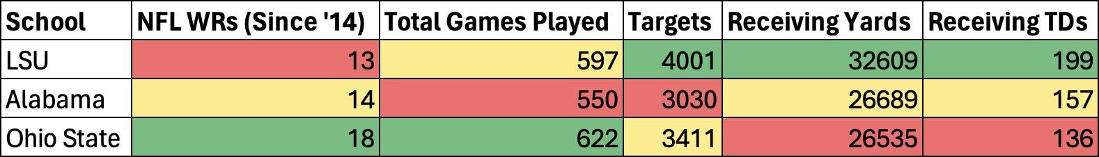 Where Malik Nabers lands exactly is still a mystery, but his likely continuance of the great LSU legacy in the NFL is not. In fact, if he and Brian Thomas Jr. both do well at the next level, LSU will further extend their recent lead over Ohio State and Alabama for bragging rights as the real "WR U" over the last decade as you can see in the image below.