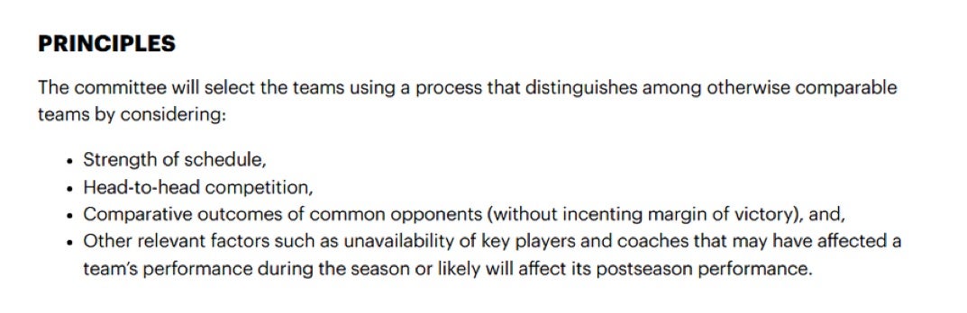When the College Football Playoff committee sets the field, there are certain criteria that they work with when making decisions. Those are 1.) strength of schedule, 2.) head-to-head competition, 3.) comparative outcomes of common opponents, and 4.) other relevant factors such as unavailability of key players and coaches that affect the team’s performance.