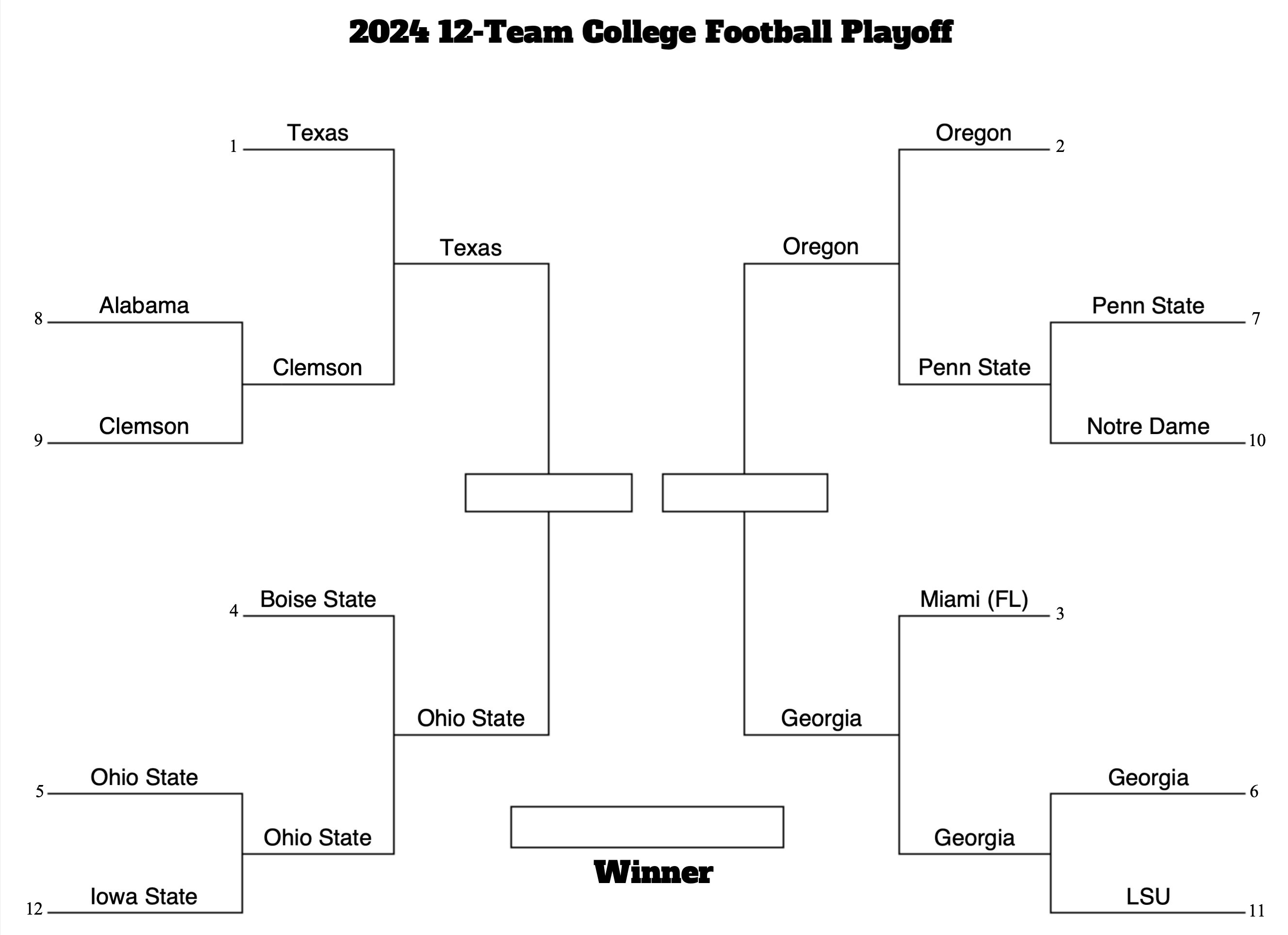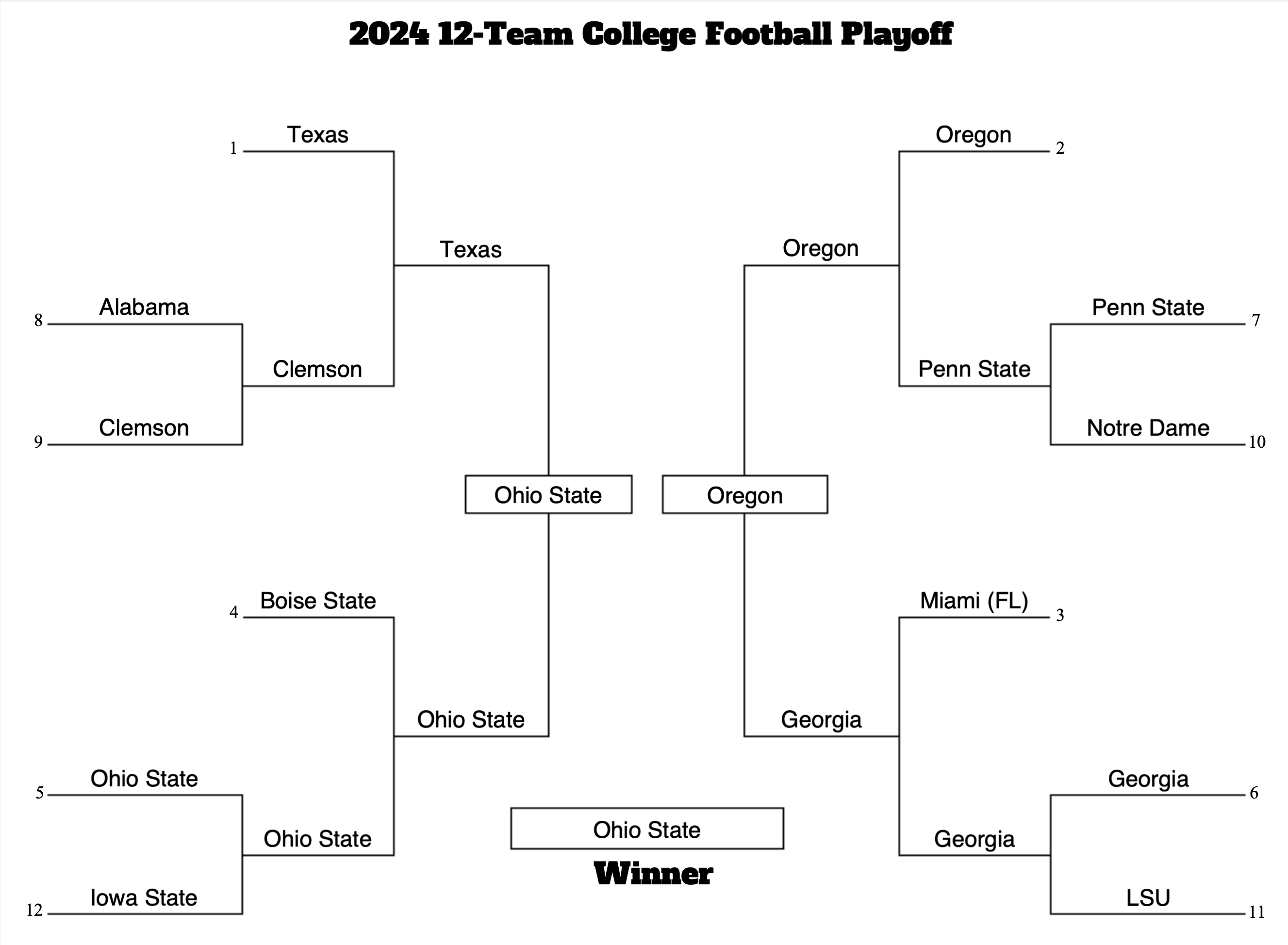 Ohio State may have just lost to Oregon, but many power rating model builds would still have them as a favorite against the Ducks on a neutral field. There's still a path for them to climb back to, not only the the Big Ten Championship, but perhaps the first overall seed. However, with a loss on their record, the path is just more difficult from a probability standpoint. Regardless, as a five seed they would demolish Iowa State or any team that came out of the Big 12 or Group of 5 Conference.