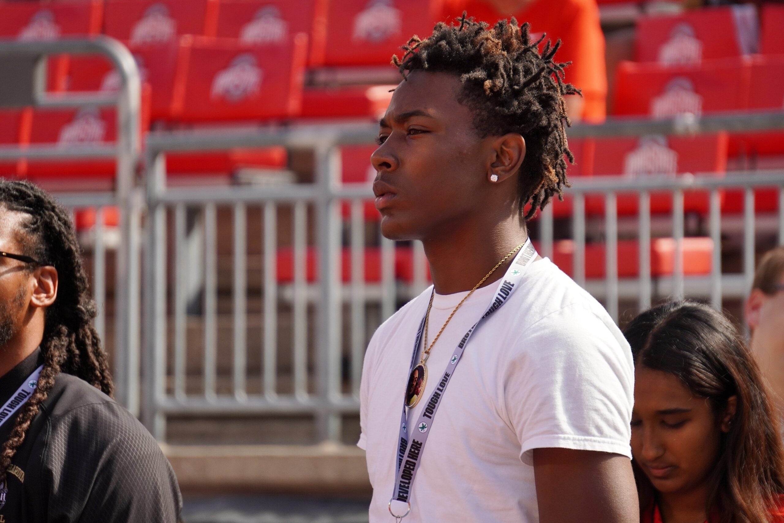 Sept. 21, 2024; Columbus, Ohio, USA; Warren G. Harding athlete Chaz Coleman watches warm-ups before Ohio State’s game against the Marshall University Thundering Herd at Ohio Stadium.