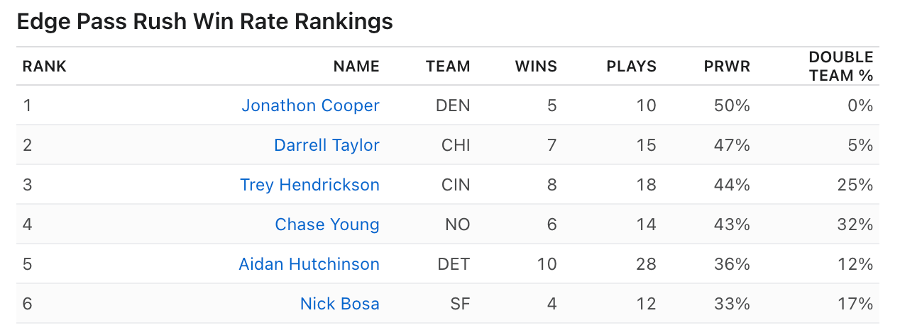 Finally, there's perennial All-Pro and Defensive Player of the Year candidate Nick Bosa rounding out the top six. Bosa won four of his 12 qualifying plays and was double-teamed on 17% of his snaps. Obviously, he draws a ton of eyes and hands and creates high-impact plays.