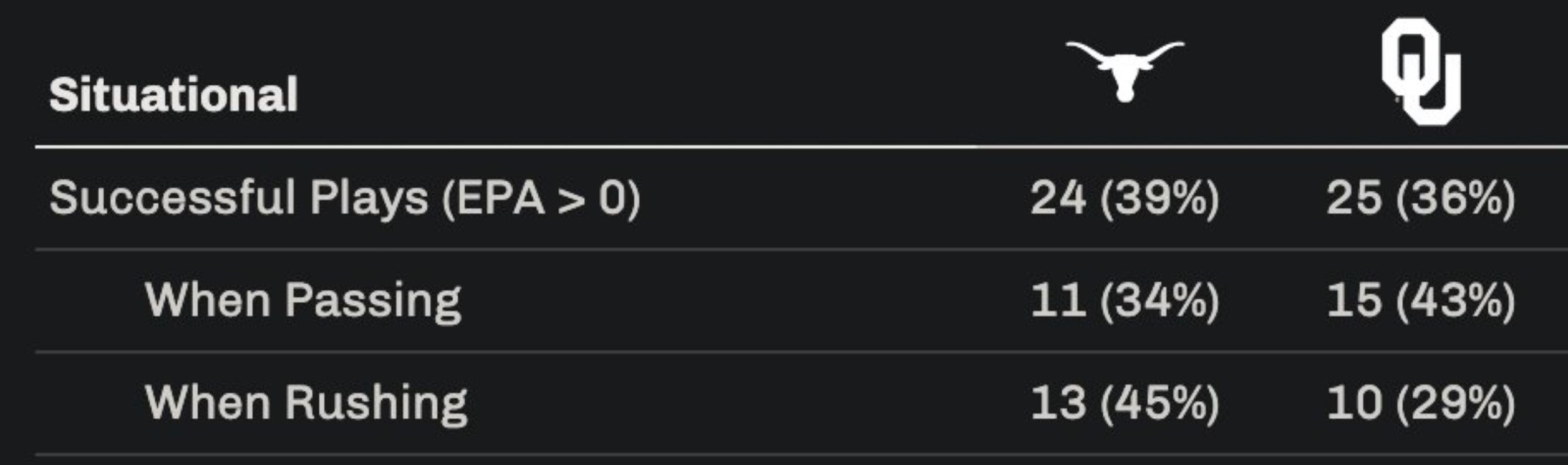 The Sooners' offense actually had more successful plays than Texas did in that game. The difference, ultimately, came down to turnovers and poor execution. In the second quarter, the Sooners fumbled the ball twice, missed a field goal, had multiple penalties, and couldn't sustain on offense. All of a sudden, the score goes from 7-3 to 21-3.