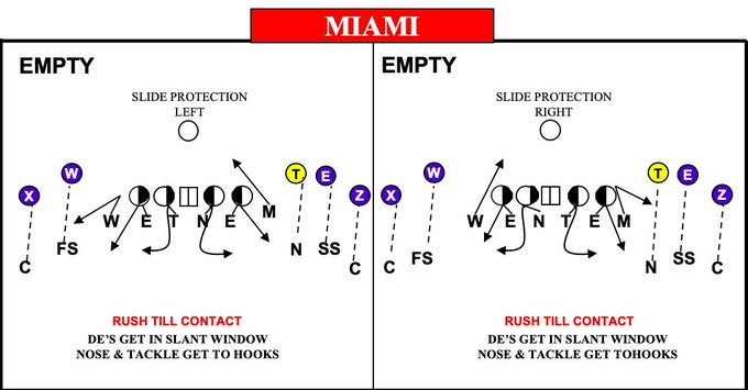 This is a six-on-five blitz against empty sets, where the quarterback is already looking to get the ball out quickly. The defensive line rushes till they get contacted, and once they get touched, they drop back and manipulate the passing lanes for the quarterback.