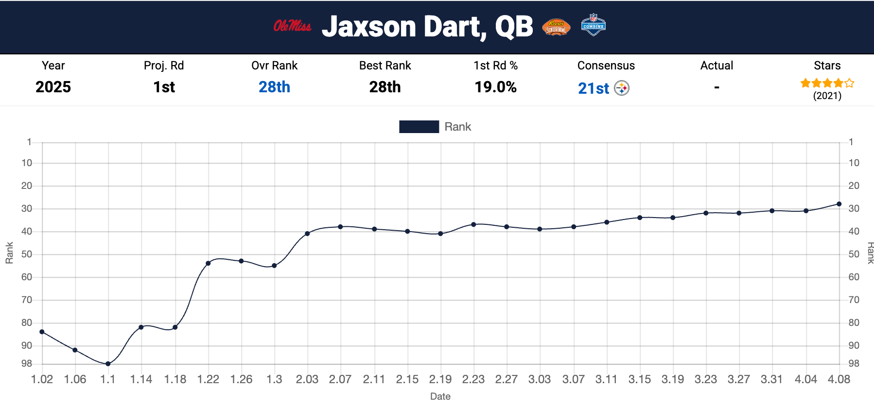 Jaxson Dart 2025 NFL mock draft data trends via nflmockdraftdatabase.com