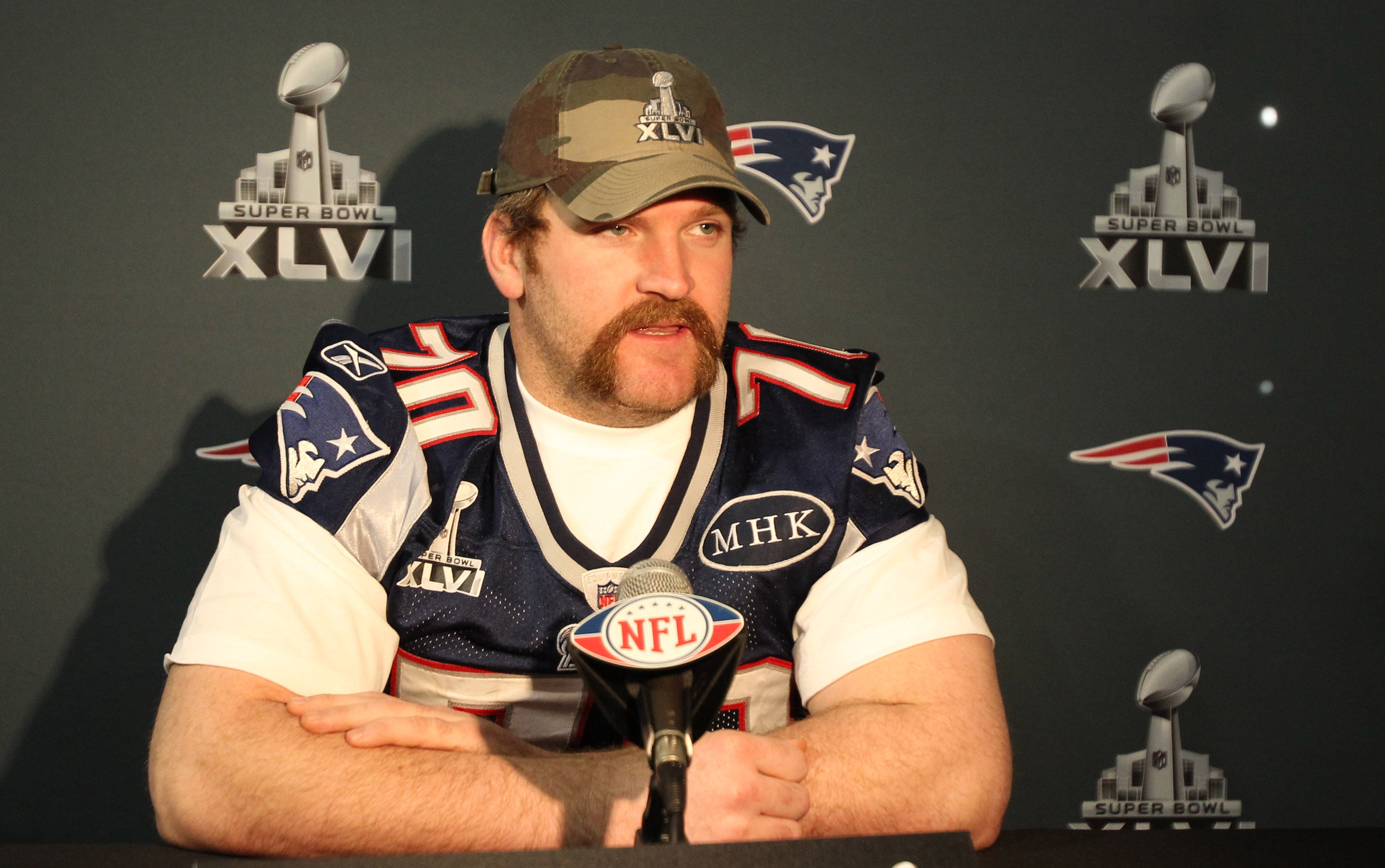 Feb 1, 2012; Indianapolis, IN, USA; New England Patriots guard Logan Mankins answers questions during a press conference in preparation for Super Bowl XLVI against the New York Giants at Lucas Oil Stadium. Mandatory Credit: Matthew Emmons-USA TODAY Sports
