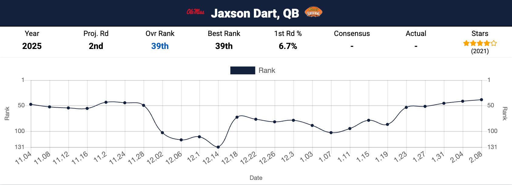 This places Dart still far below Cam Ward (QB, Miami) and Shedeur Sanders (QB, Colorado), but just ahead of Jalen Milroe (QB, Alabama) in the QB3 slot via consensus mock draft data.