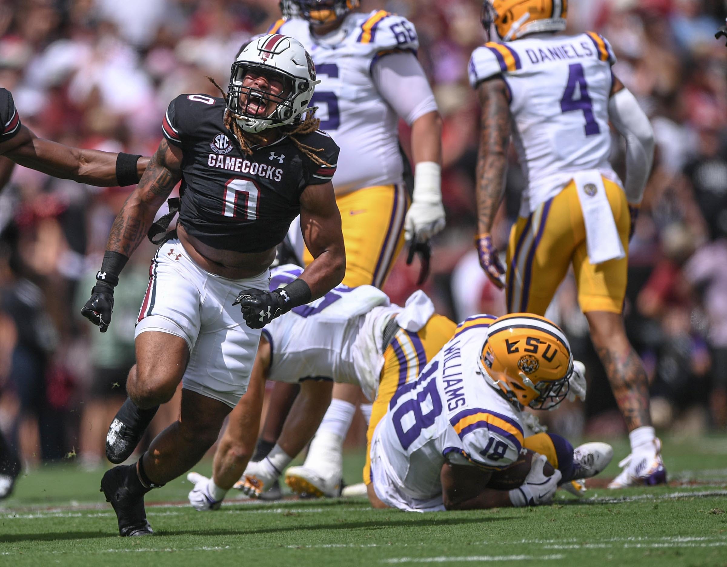 South Carolina linebacker Debo Williams reacts after tackling Louisiana State University running back Josh Williams (18) during the first quarter at Williams-Brice Stadium in Columbia, S.C. Saturday, September 14, 2024.