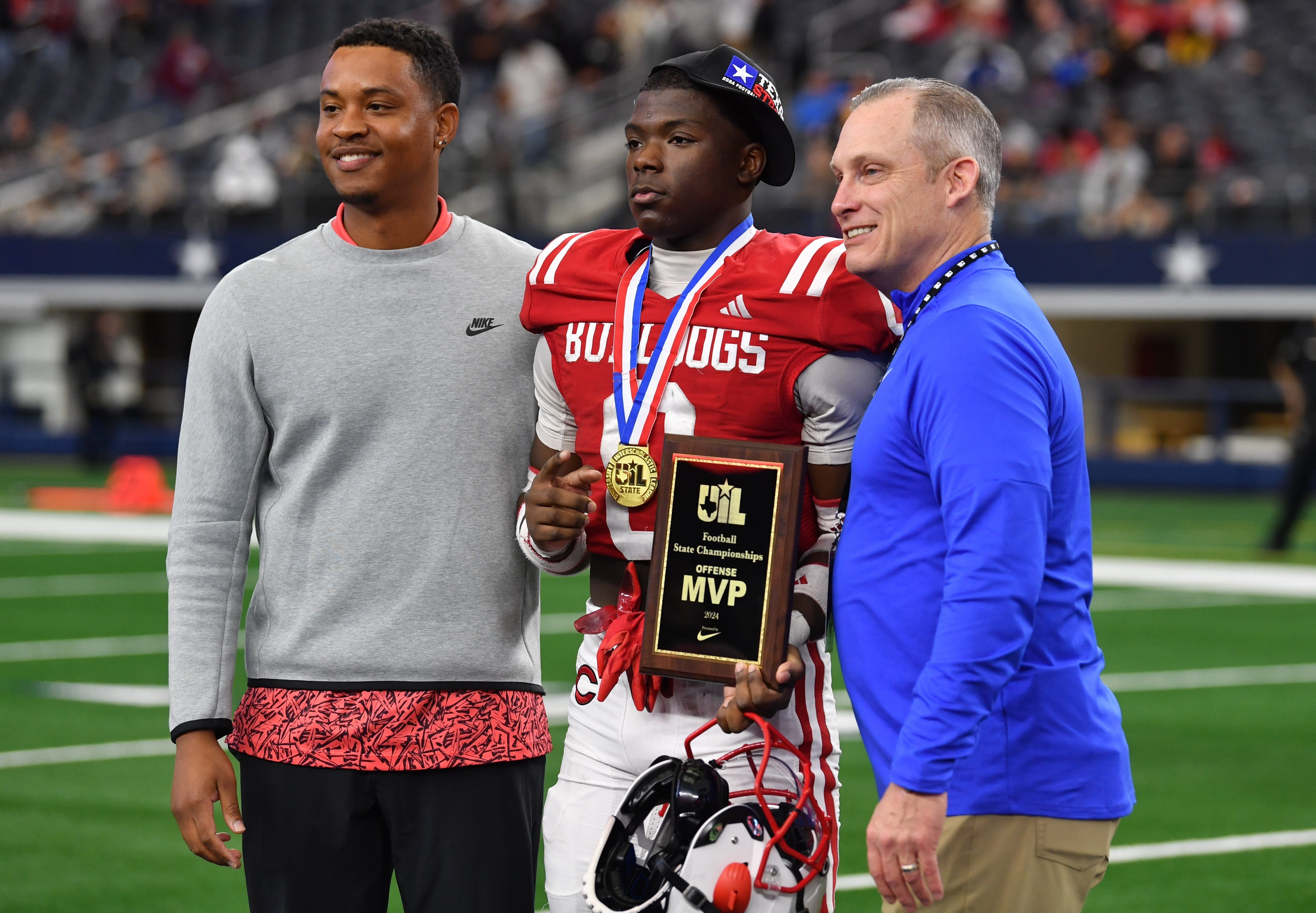 Carthage’s Kelwin Edwards wins the Offensive MVP award during the 4A DII UIL Texas State Football Championship game against Waco La Vega on Friday, December 20, 2024 at AT&T Stadium in Arlington.