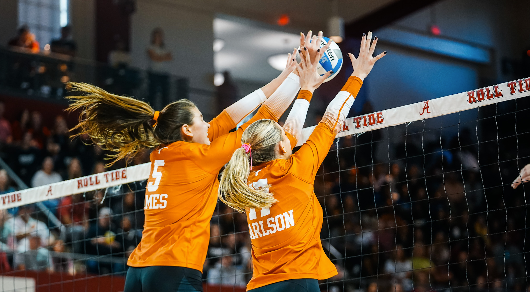 Setter Averi Carlson, right, and middle blocker Ayden Ames go up to block a ball against the Alabama Crimson Tide on Sunday, Nov. 17, 2024.Gracie Oliver/ Texas Athletics