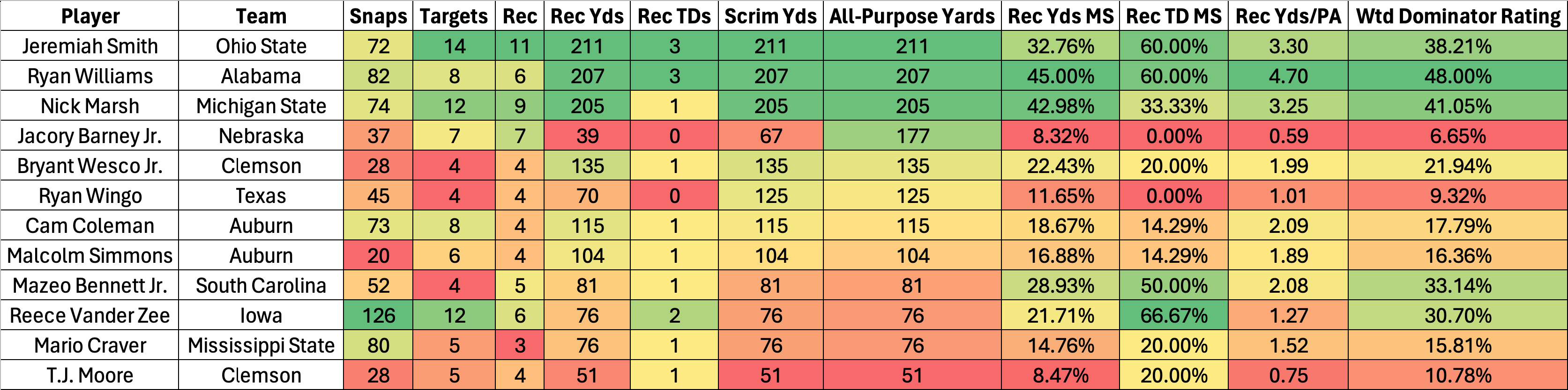Williams leads all true freshman in receiving yard market share ( accounting for 45% of Alabama's receiving yards), receiving yards per team pass attempt, and dominator rating. He is quite seriously on pace for one of the most significant true freshman breakout seasons of all time.