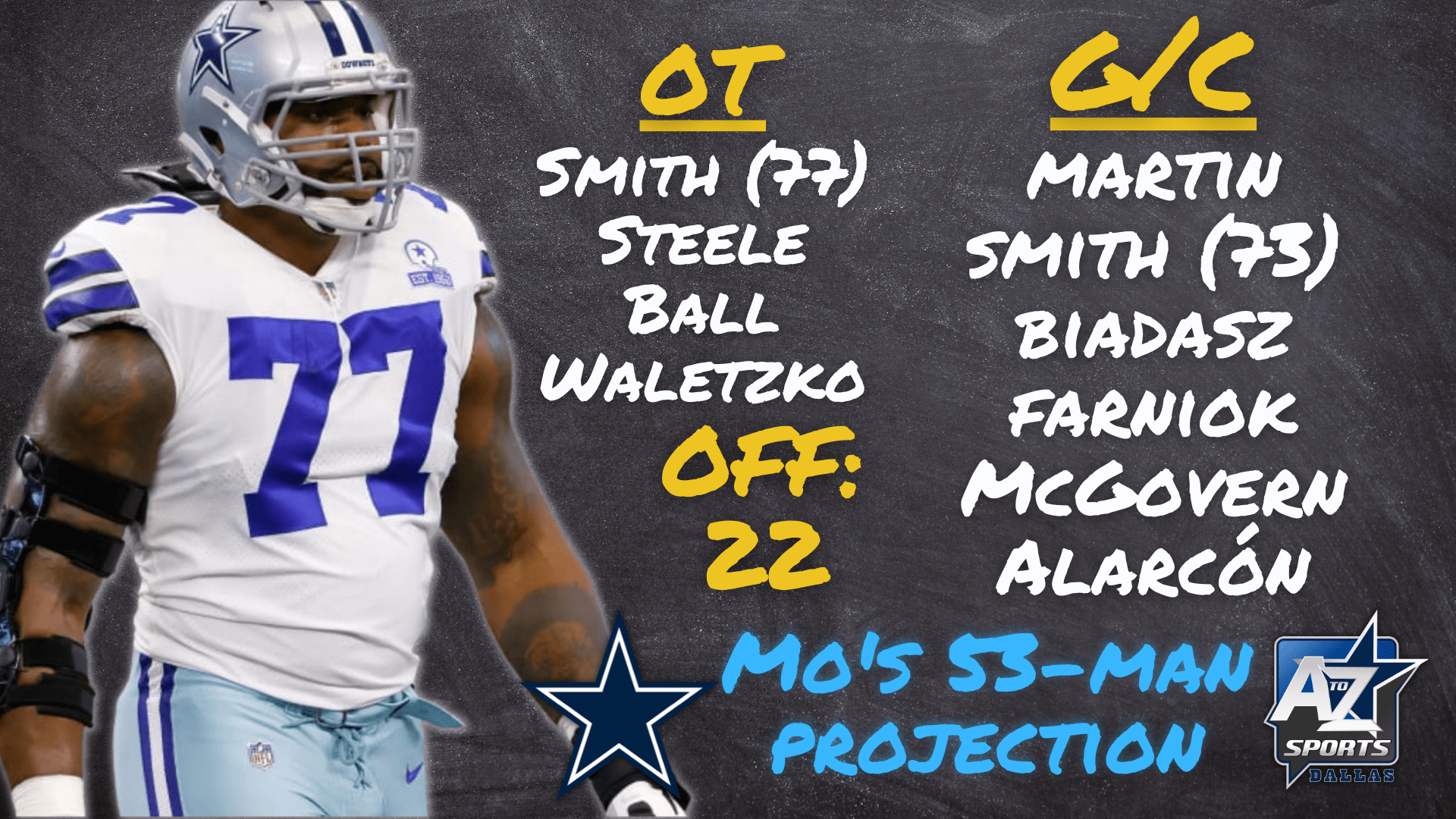 En mi proyección muy tempranera del roster de 53 jugadores anoté seis guardias/centros para Cowboys y cuatro tackles. Jerry Jones mencionó que el equipo ya no buscaría un veterano para la posición de tackle, confiando en lo que el equipo tiene hoy en día.