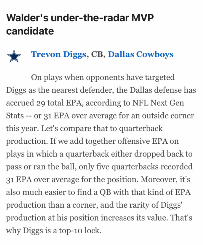 ESPN Sports Analytics Writer Seth Walder makes his case why Diggs deserves some serious recognition in the early-season MVP conversation. Walder points to Diggs' impact on expected points added for the Cowboys defense and compares it to that of a quarterback.