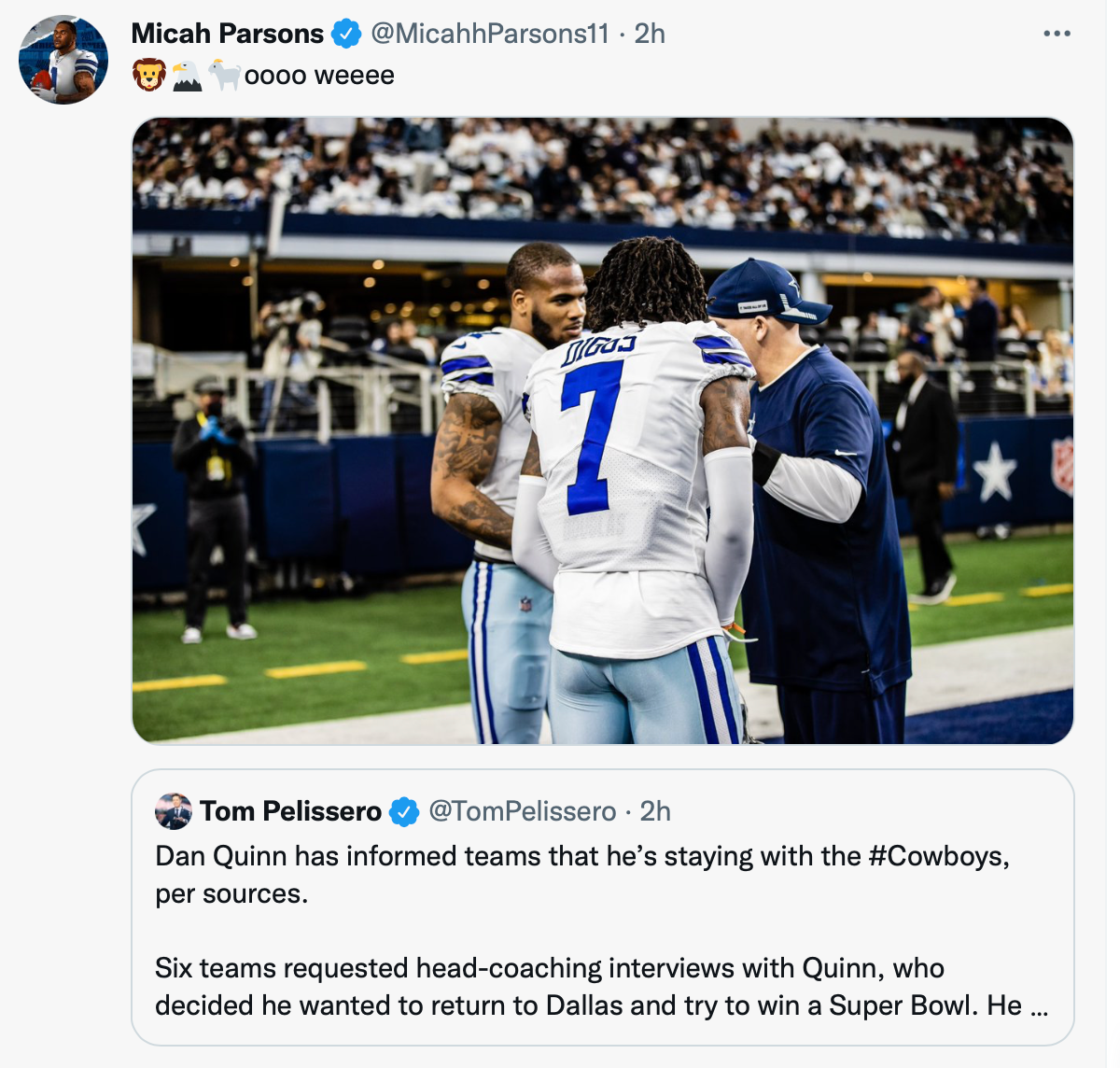 Numerous Cowboys players, including star rookie linebacker Micah Parsons, were excited to learn that Quinn was staying.