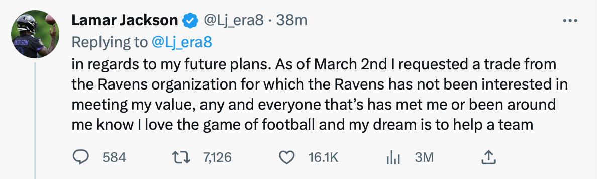 Jackson took to Twitter to reveal that he requested a trade on March 2.