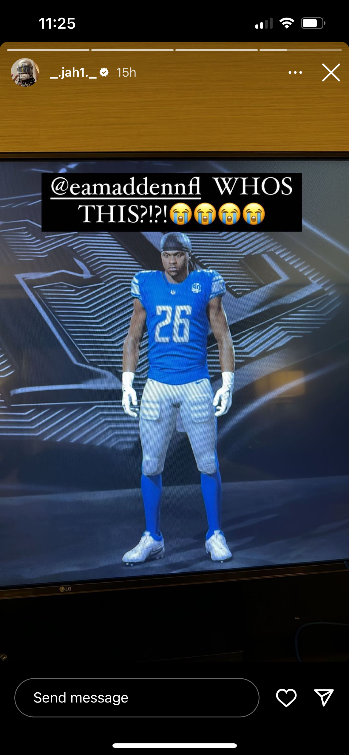 That looks nothing like Jahmyr Gibbs. That looks more like that thing where people go and create the entire draft class on the previous years Madden. That is a created player all the way. It looks like a character that was created for a my player mode or something. Only it's a non playable character that you just see in the background from time to time.