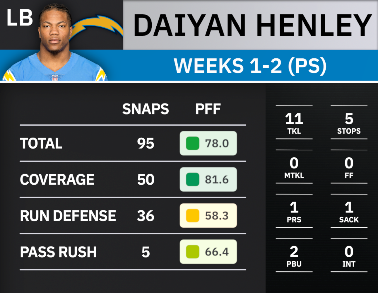 So far in the preseason, Henley has been on the field for 91 snaps across the first two weeks. He's contributed with 11 tackles, two pass breakups, a sack, and a PFF grade of 78.0.