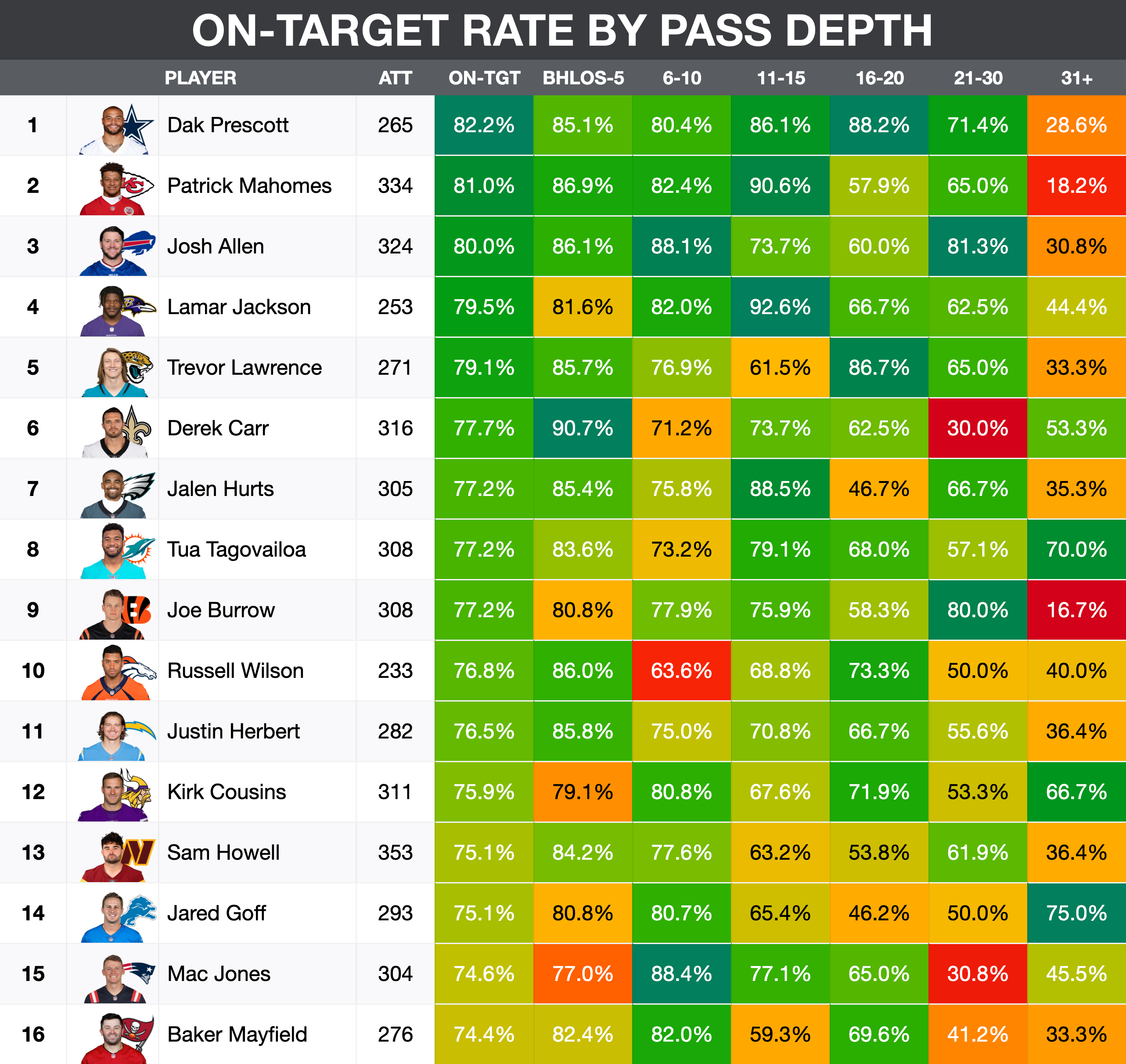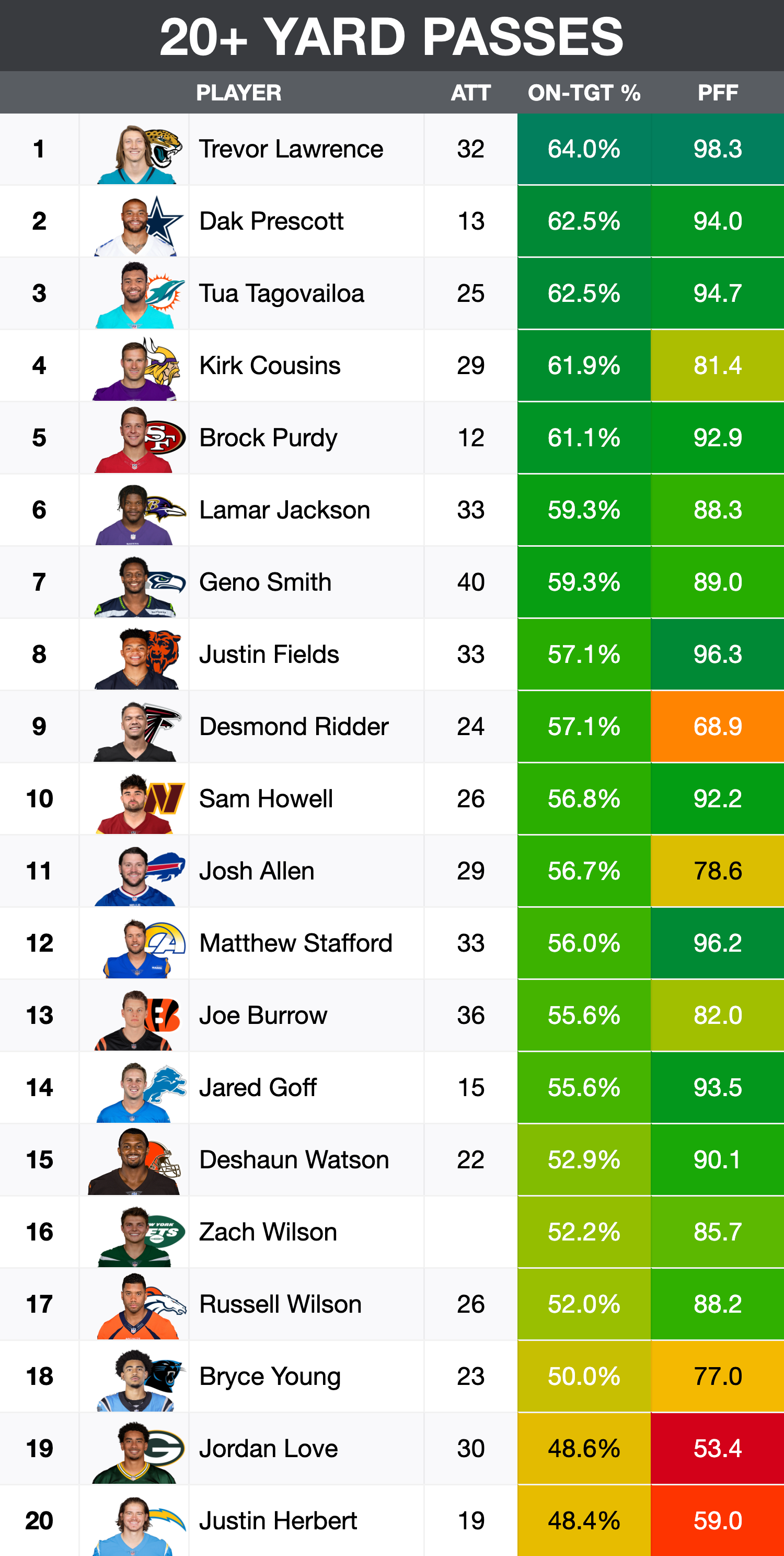 Howell ranks highly in the NFL for his deep passing, which is a vital component of Eric Bieniemy's offense. His arm strength and accuracy are instrumental in executing successful deep passes. His touch along the sidelines and ability to place deep shots precisely are showcased as significant strengths.