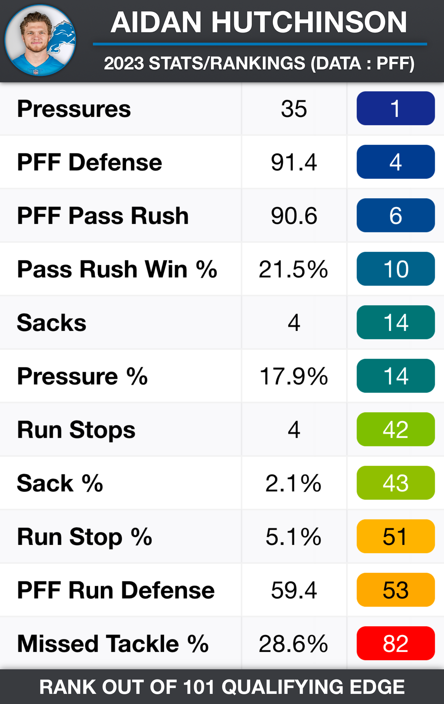 So Aidan Hutchinson has taken exactly the step you wanted to see from him year two. He's really developed into a dominant pass rusher that can win in so many different ways. And like I said, really the only athletic limitation with him is arm length. He isn't like a Haason Reddick level speed rusher or anything.