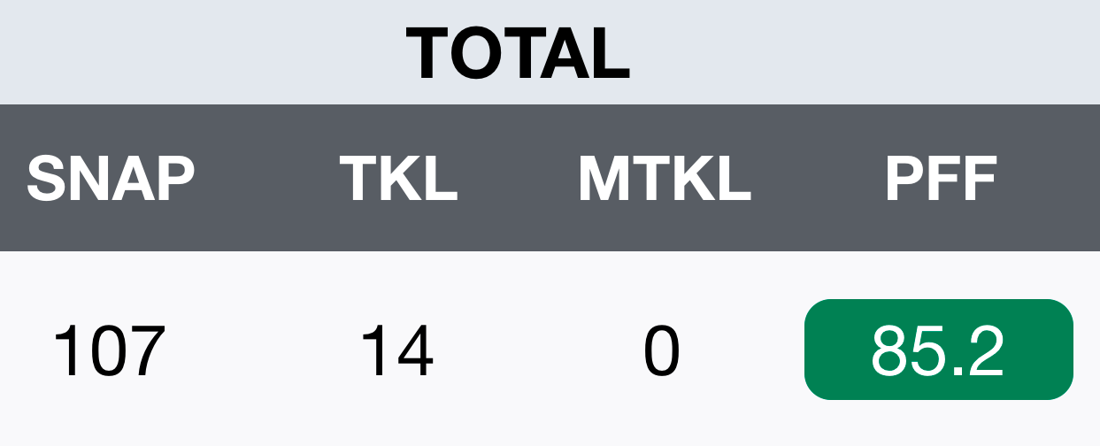 But his biggest impact so far has come as a pass rusher. On 15 pass rushing snaps he has 4 pressures in a sack and a 43 percent pass rush win rate. It is a small sample size, but this was his game in college. In his senior year, he had 55 pressures, 12 sacks, and a 93.3 pass rushing grade.