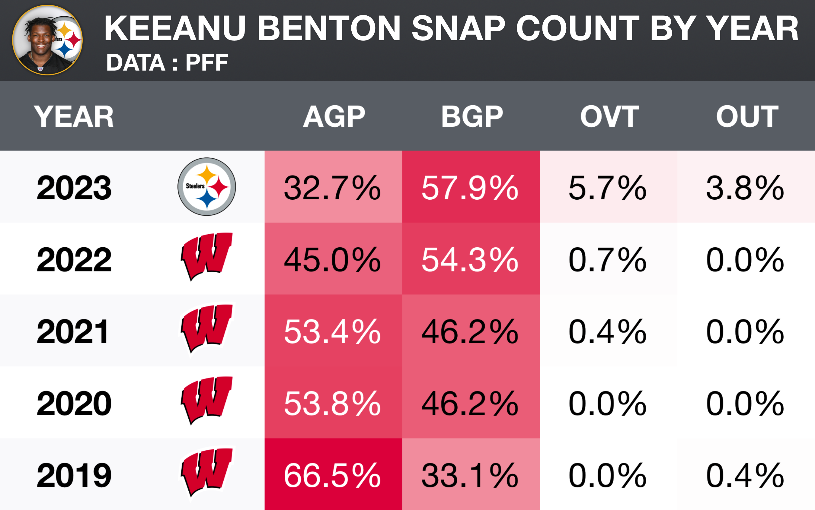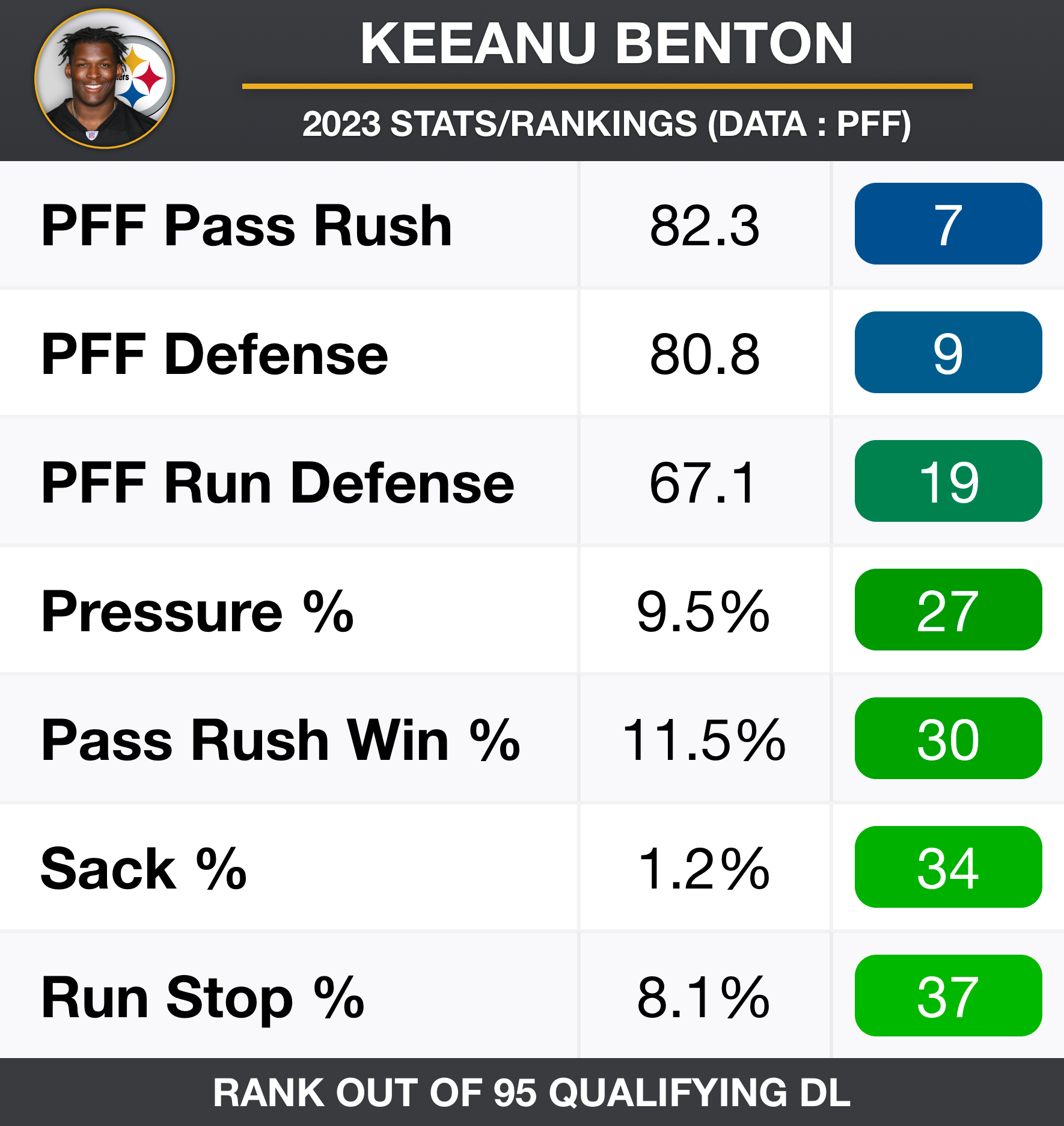 Keanu Benton made my Mid Season All Rookie team, obviously as the second defensive tackle to Jalen Carter. And like with pretty much every Steelers rookie, he's playing great, but on a limited sample size. He's played 159 snaps so far this year, and he ranks in the top third in most defensive tackle stats. He's creating a lot of pressure as a pass rusher, doing a great job anchoring and run defense.