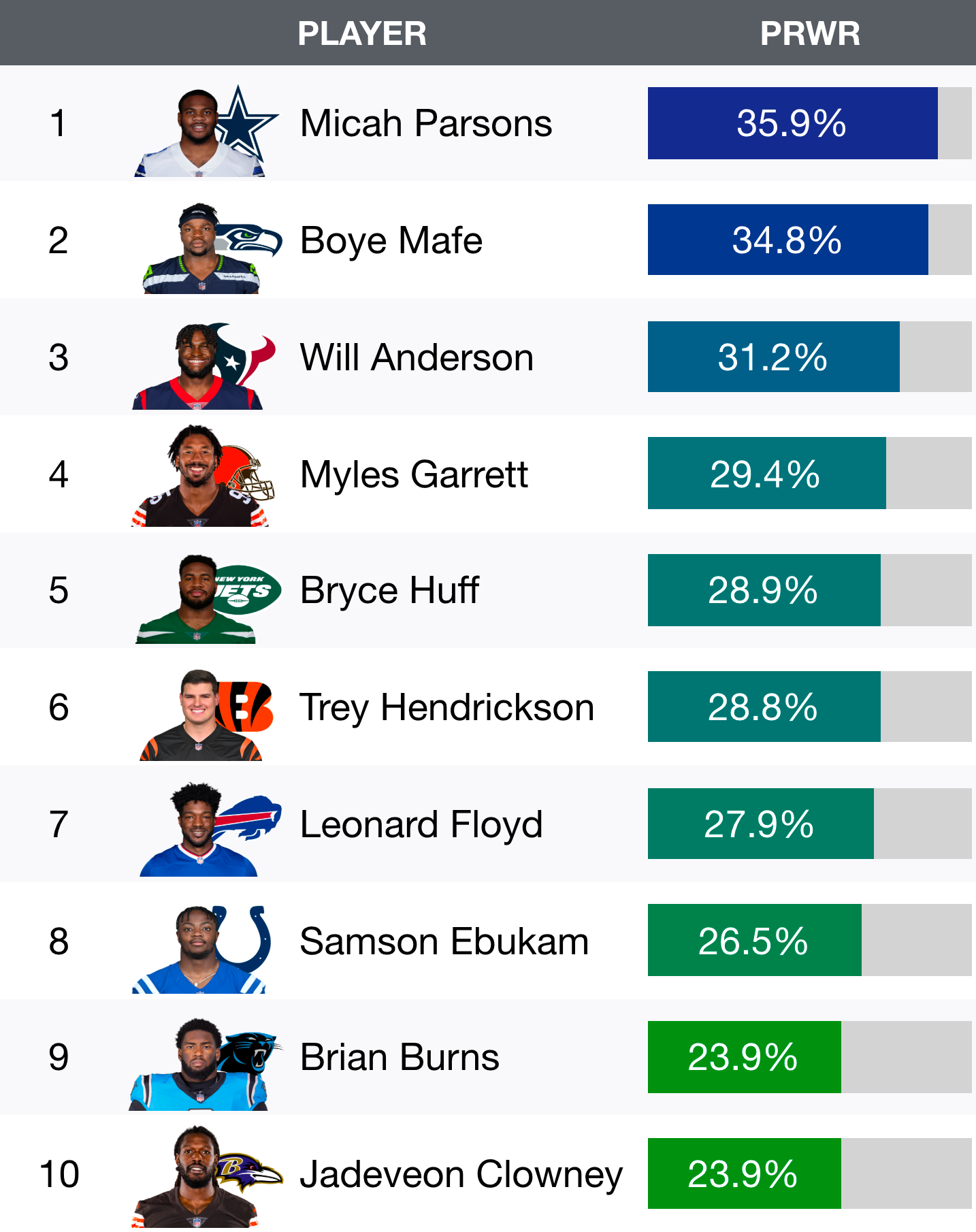 But Will Anderson's already playing like a top ten to fifteen edge rusher. I mentioned ESPN's pass rush win rate at the beginning of the video, which is based on the NextGenStats tracking, But looking at PFF's film based win rate numbers, which go back to 2008, Will Anderson would have the highest pass rush win rate ever for a rookie at 17.
