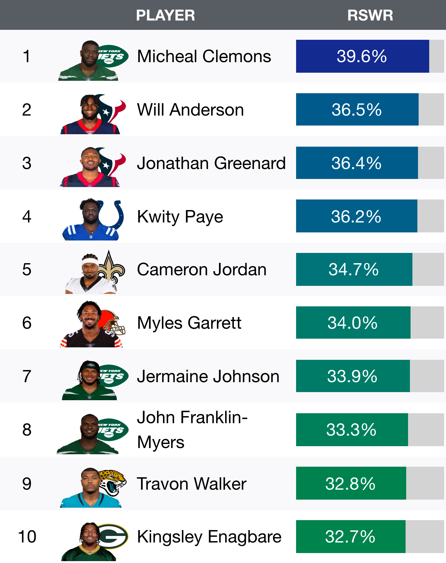 But through the first four weeks, he looks like one of the best players from this class, and a player that's going to give Houston a great return on investment. Right now he ranks third among edge rushers in ESPN's pass rush win rate, and second in run stop win rate. So he's impacting both phases at a high level, and even though he only has one sack, the per snap numbers are a lot more stable over the course of a season.