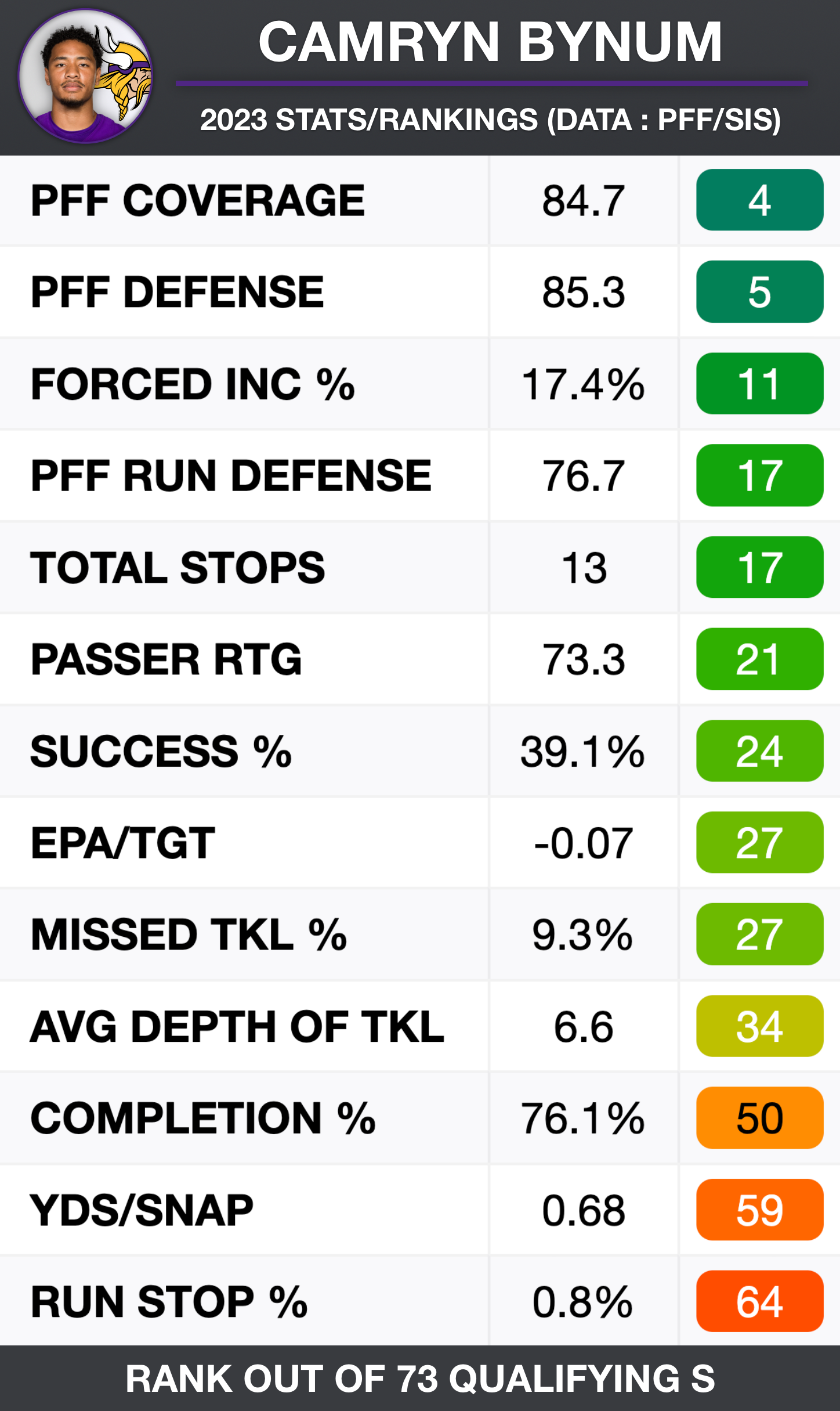 The Vikings are blitzing at a historic rate, 59.7% on the year, and a lot of the plays that he's quote unquote given up, he'll be in off coverage, and the two results of the play are either that the pass rush gets home, or the offense gets an easy completion. So you see he ranks kind of low in the yards per cover snap, but he's only allowed two receptions of over 20 yards.He's really quick and instinctive, breaking on passes over the middle of the field.
