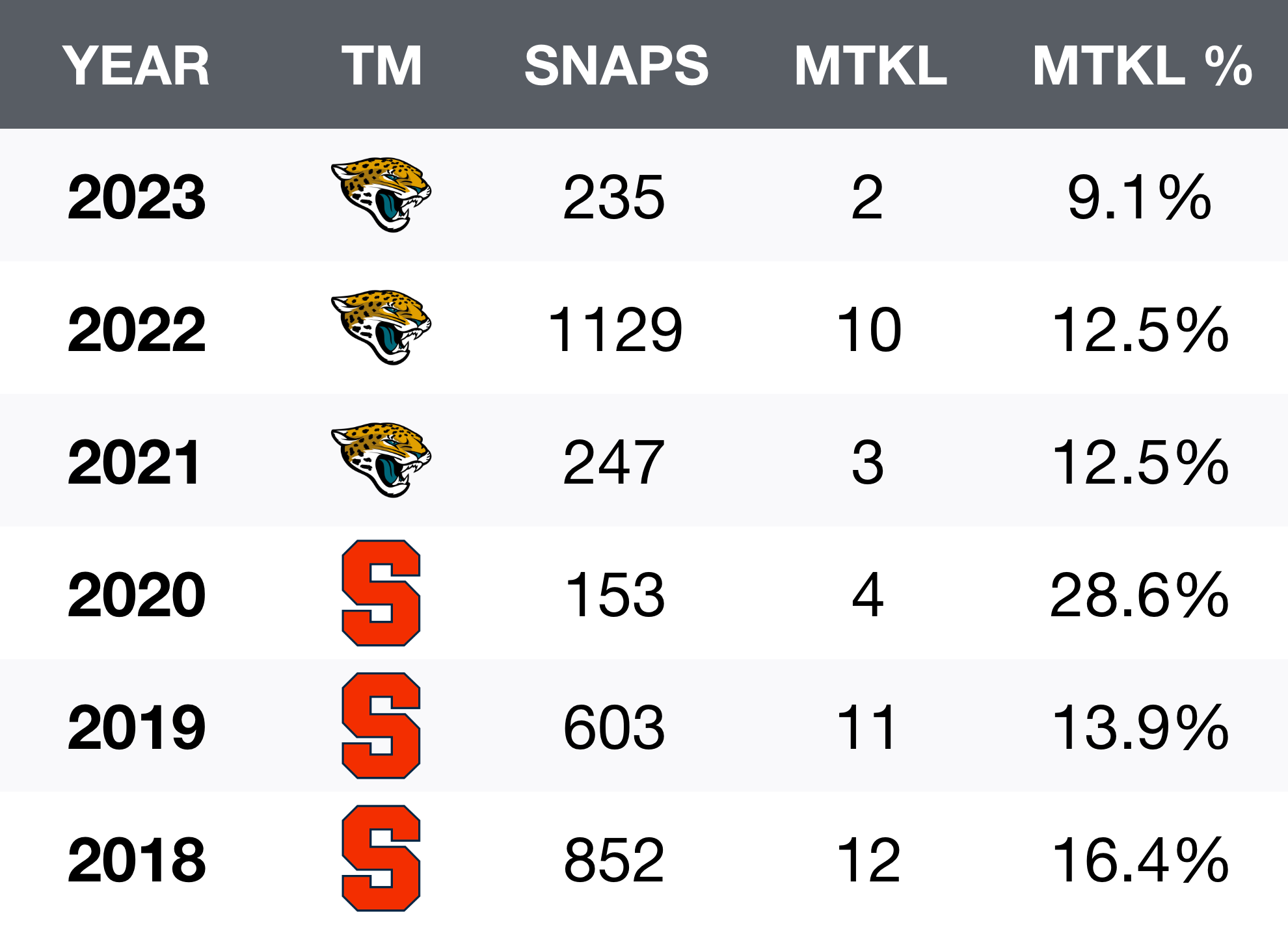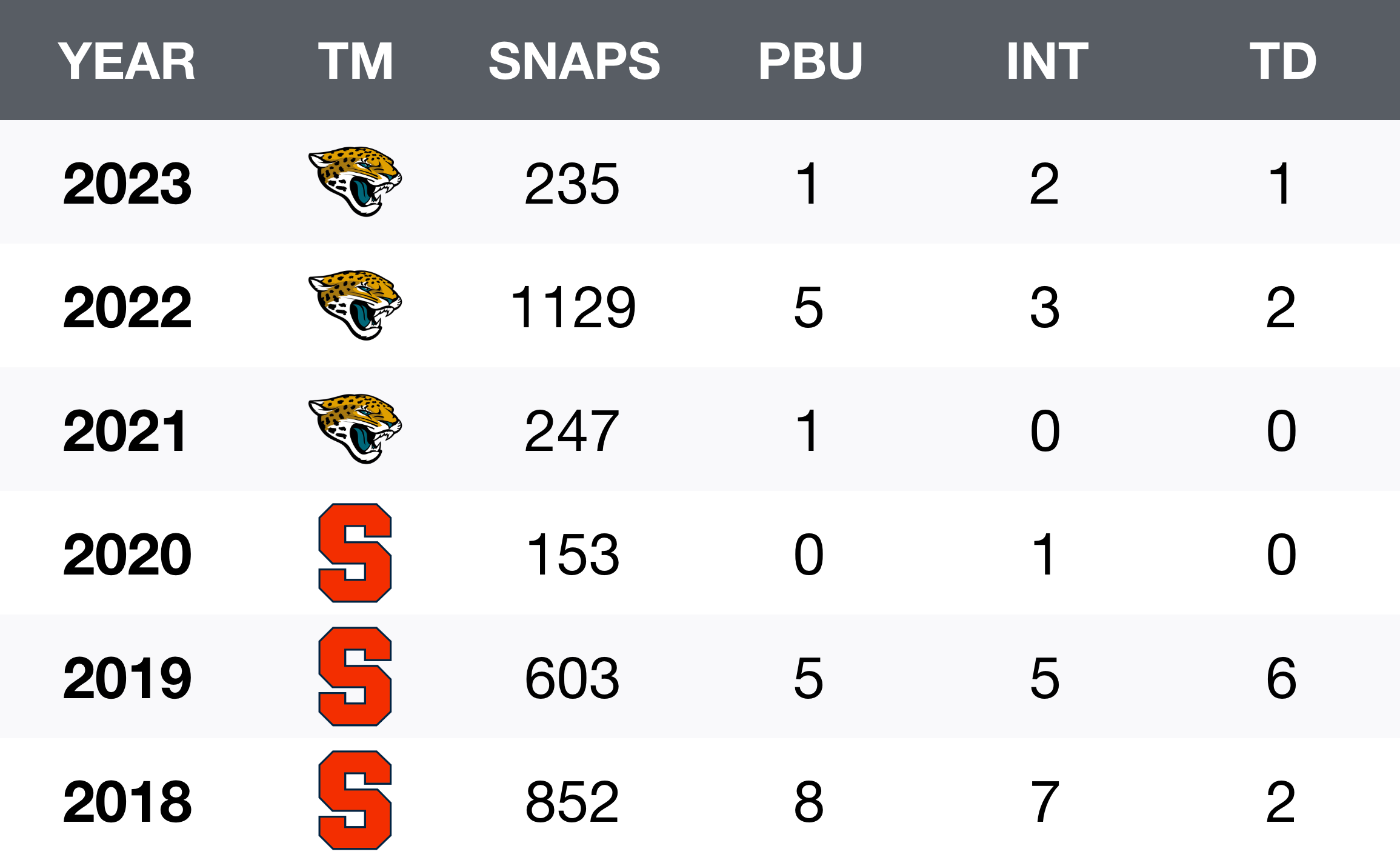 And then his third year at Syracuse was cut short after an ACL tear, and he had a lower body injury that caused him to miss four games the year before. So the injury concerns and inconsistencies in coverage caused him to fall to the third round, but in Jacksonville, he stayed healthy, maintained his ability to make big plays, and improved significantly in the areas he struggled with in college.