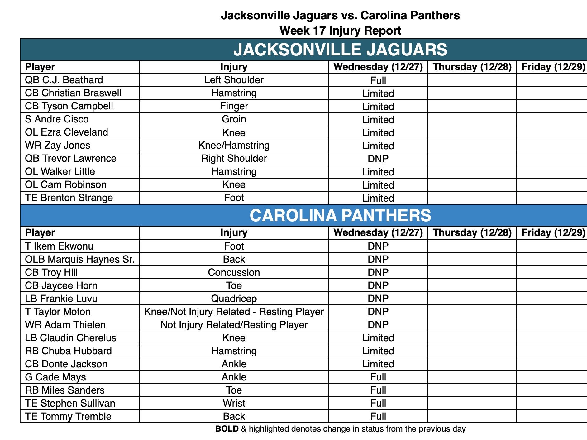 Jaguars' Wednesday injury report for Week 17 vs. Panthers