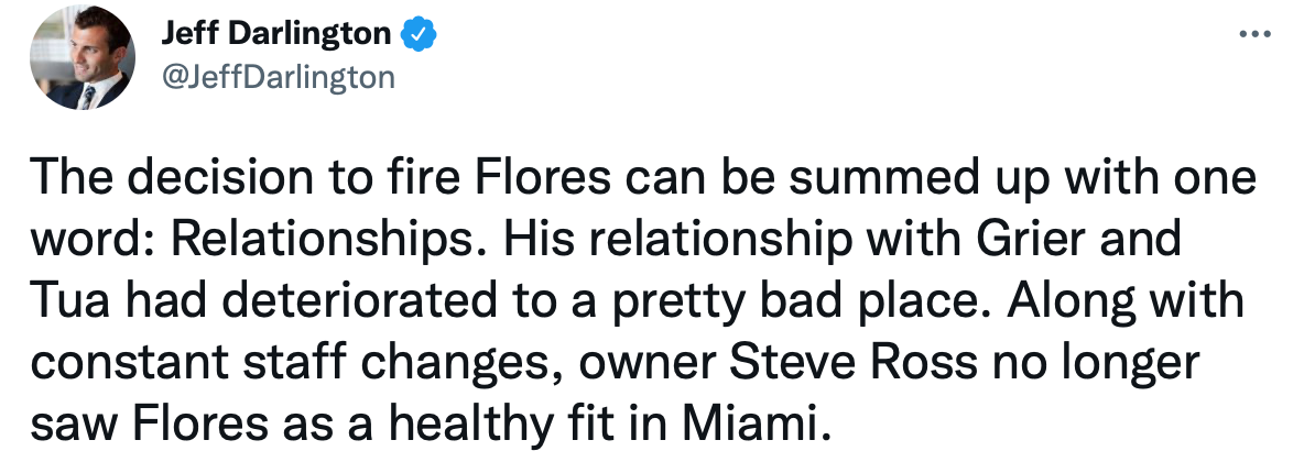 ESPN's Jeff Darlington reported on Monday that Flores was fired due to his poor relationship with quarterback Tua Tagovailoa and general manager Chris Grier.
