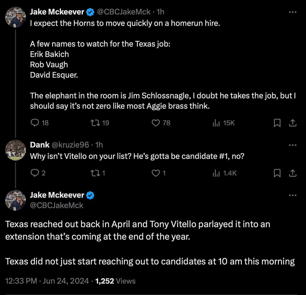 According to CBC Texas reporter Jake McKeever, the Texas Longhorns reached out to Vitello in April. McKeever said that the conversation between Texas and Vitello was the catalyst for a yet-to-be-announced contract extension for the Tennessee head coach.
