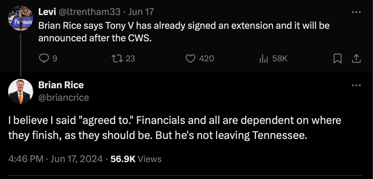Vitello was likely going to receive an extension after another great season anyway. But the reported interest from Texas certainly didn't hurt Vitello's chances of getting an extension done with the Vols this offseason.