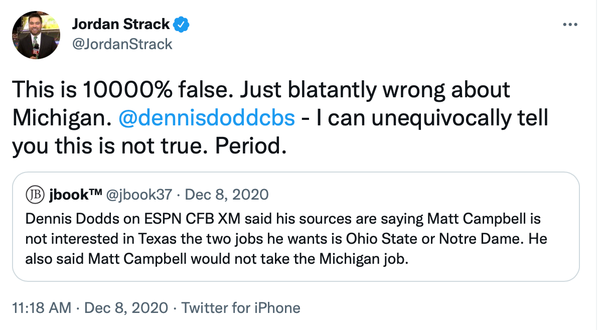 CBS Sports' Dennis Dodd reported in 2020 that Campbell would only have interest in taking a head coaching job at Ohio State or Texas. Jordan Stack, a Toledo area reporter (where Campbell coached from 2009-2015), disputed that report.