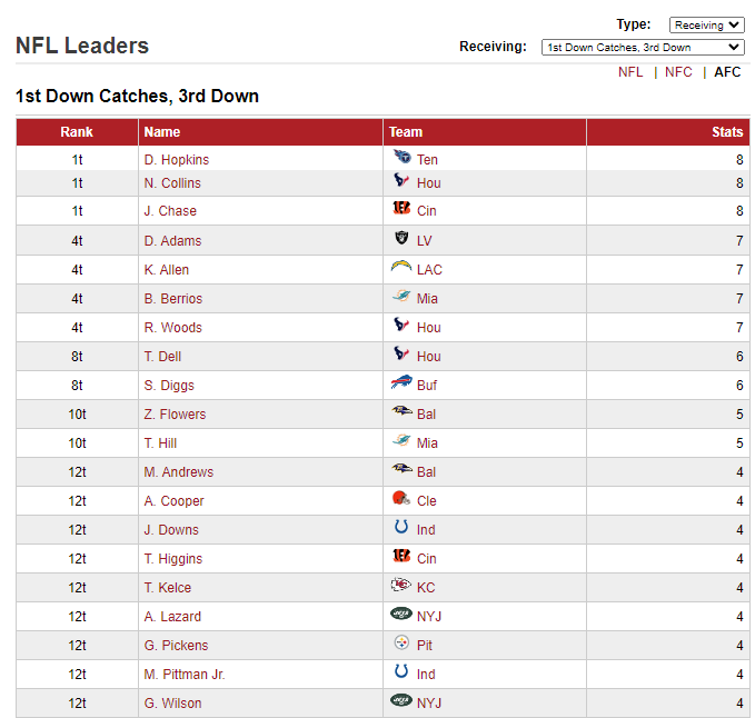 In Sunday's win over the Cincinnati Bengals, Hopkins had three third-down catches that converted into first-downs and kept Tennessee's offense alive. He heads into Week 5 tied for the lead in the AFC with eight first-down catches on third downs.