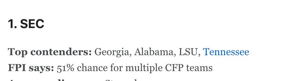 Tennessee fans might see this and think "duh, of course the Vols are a playoff contender". And while that thought process isn't misguided, it's also not unusual for ESPN to overlook Tennessee a bit.