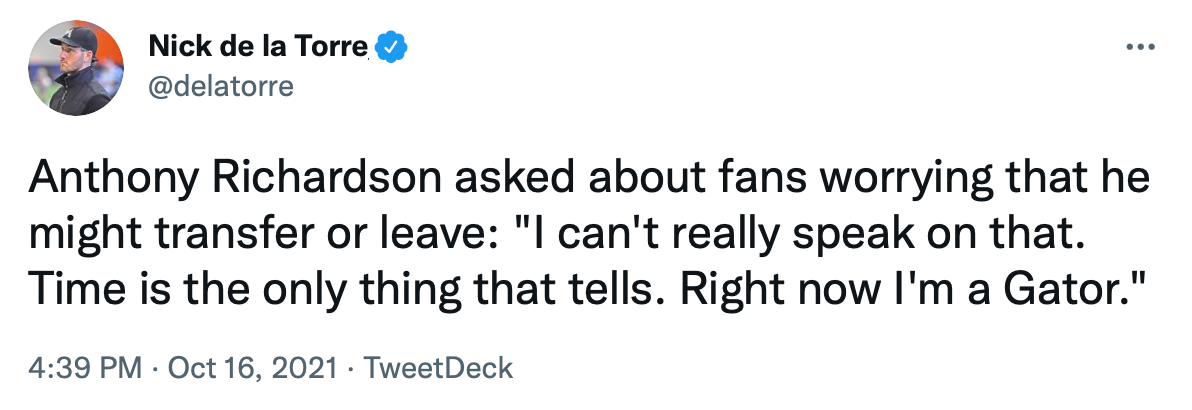 If Richardson, a former four-star recruit, decides to leave after this season, it would be a major blow to Florida's roster.
