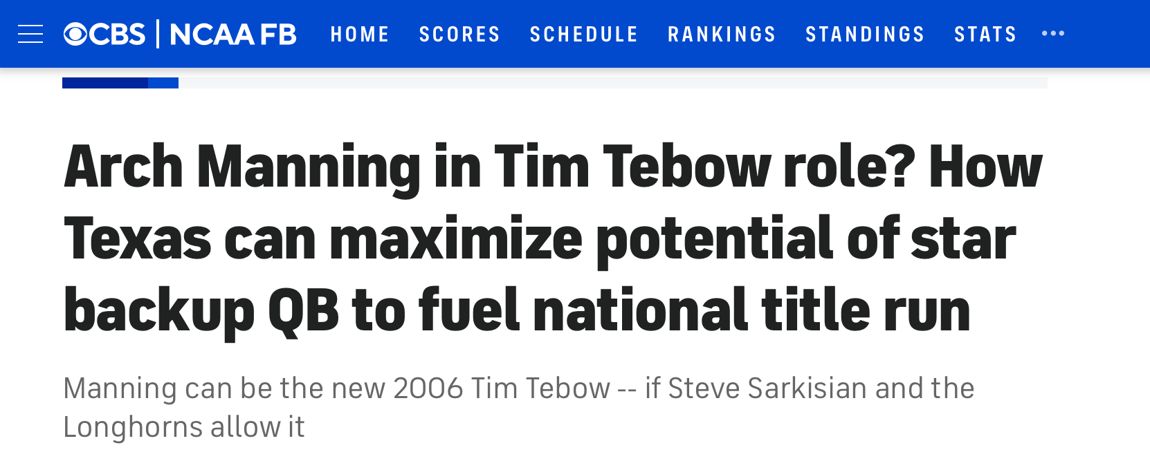 CBS Sports made a suggestion for Texas Longhorns quarterback Arch Manning late last month that was inspired by legendary Florida quarterback Tim Tebow.