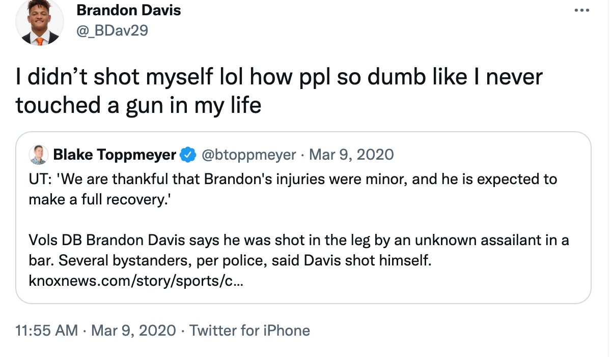 The initial report suggested that Davis accidentally shot himself at the bar. Davis, however, quickly dispelled that rumor via a Tweet.
