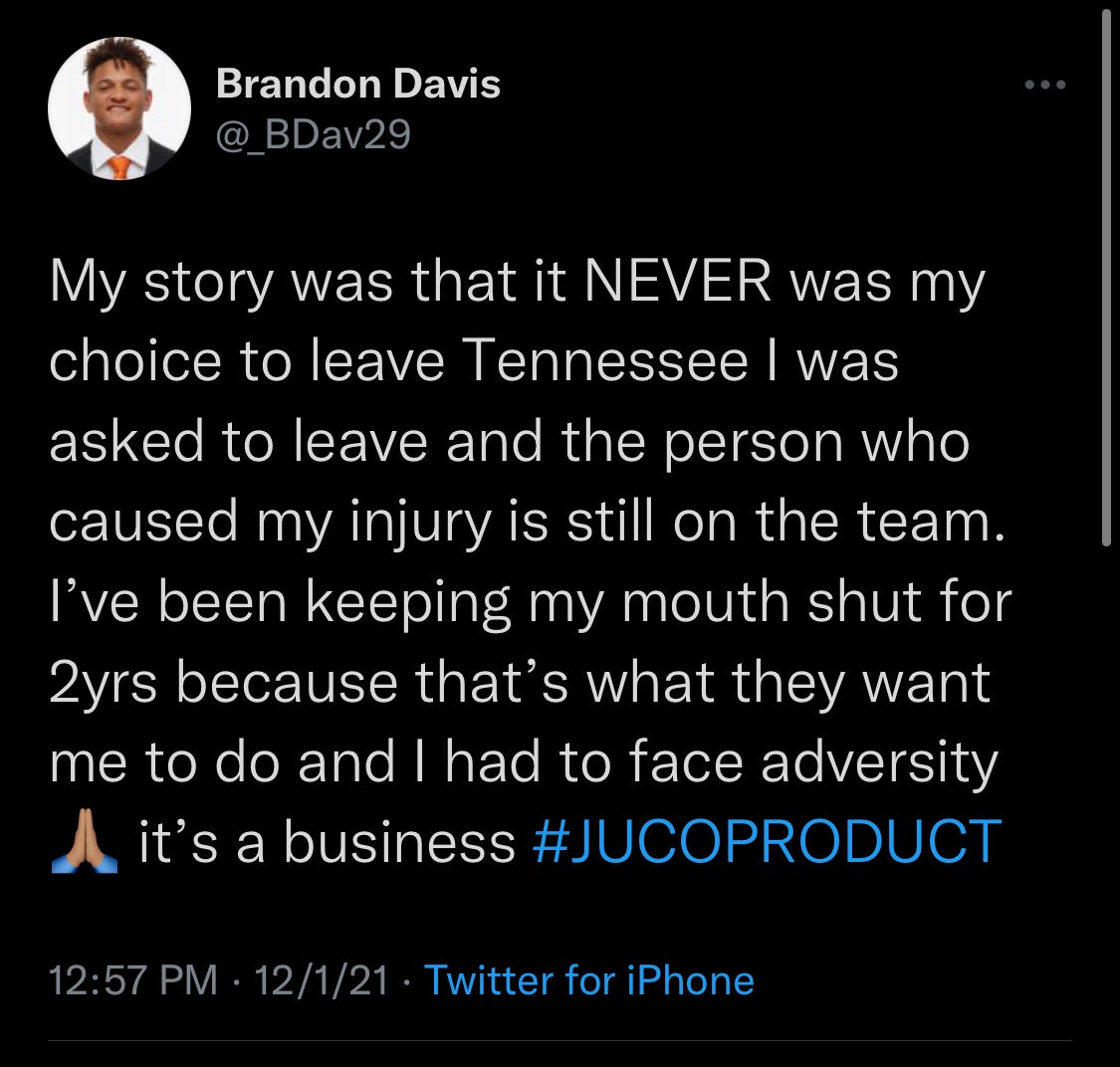 Former Tennessee Vols defensive back Brandon Davis took to Twitter on Wednesday to slam former UT head coach Jeremy Pruitt.