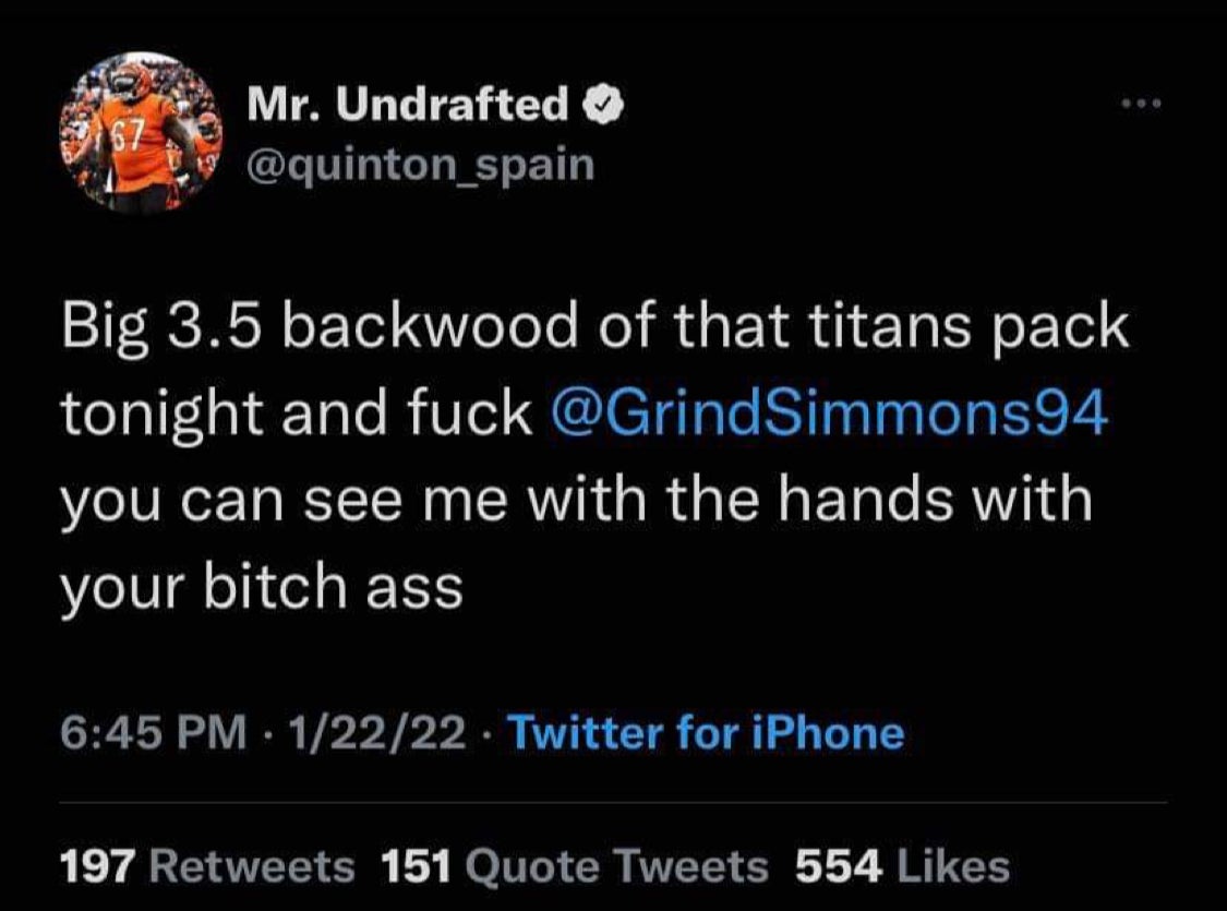 Cincinnati Bengals offensive lineman Quinton Spain blasted Tennessee Titans defensive lineman Jeffery Simmons in a deleted tweet on Saturday.