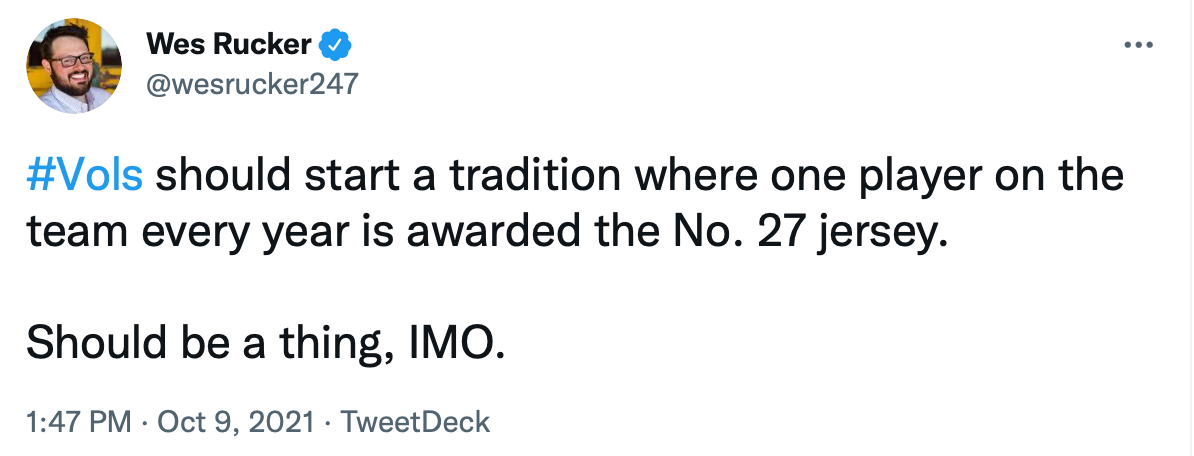 Wes Rucker, who covers the Vols for 247Sports, proposed that Tennessee give the number 27 to a player each year that earns the honor of wearing it.