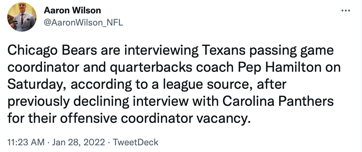 Pro Football Network's Aaron Wilson reported on Friday that longtime NFL assistant coach Pep Hamilton interviewed this week with the Chicago Bears for their vacant offensive coordinator position.