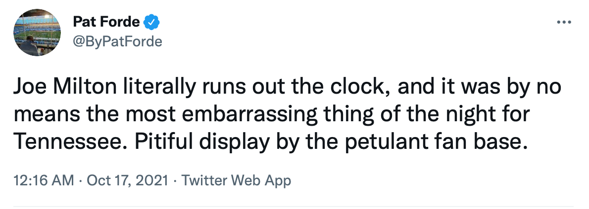 Sports Illustrated writer Pat Forde called Tennessee fans "petulant" on Saturday night after an undetermined number of fans at Neyland Stadium threw trash on the field in protest of a poorly officiated game.