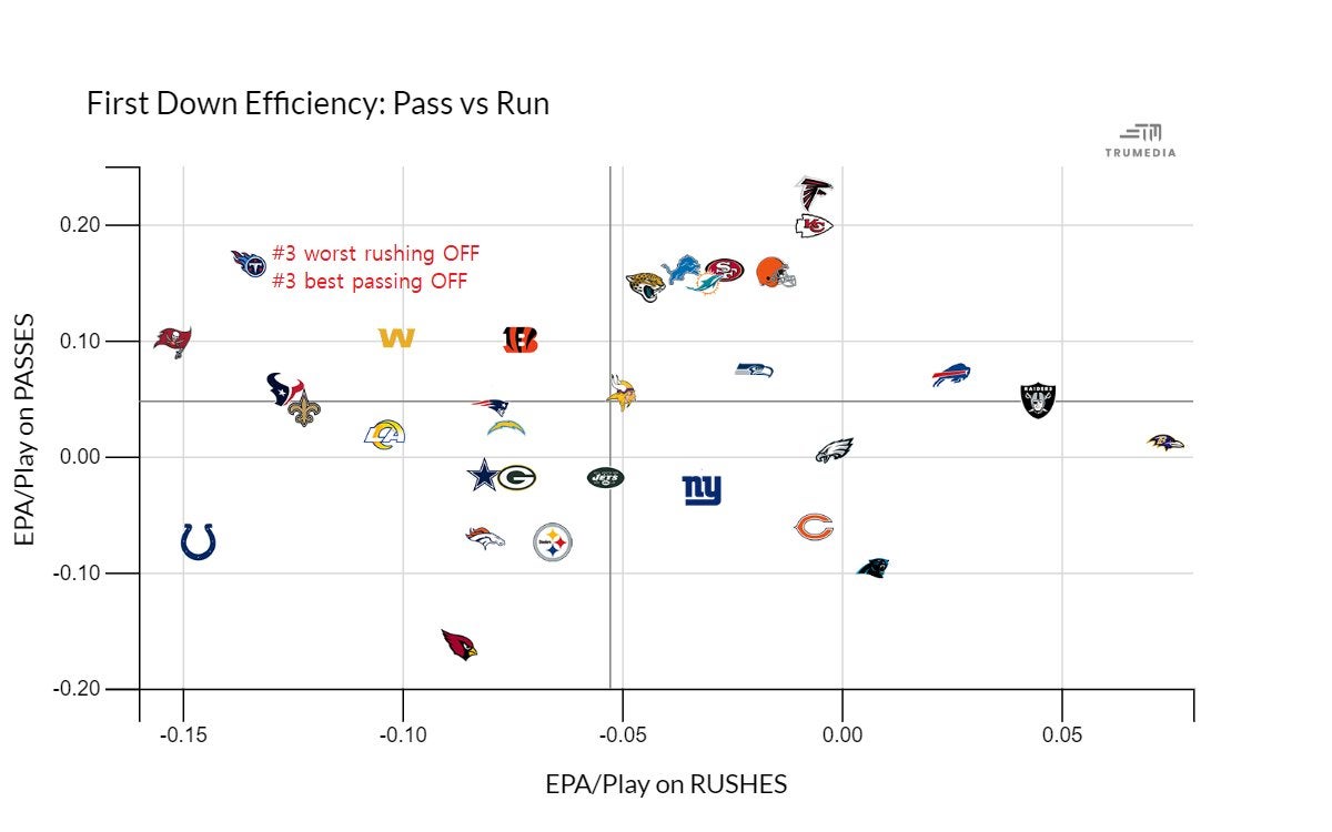Here is where it gets even crazier. The Titans' first-down passing offense was the third most efficient in the NFL, yet they rarely passed. This could be why Sharp jokes that Todd Downing was a double agent for the team. This graphic puts into perspective just how crazy Downings' playcalling was: