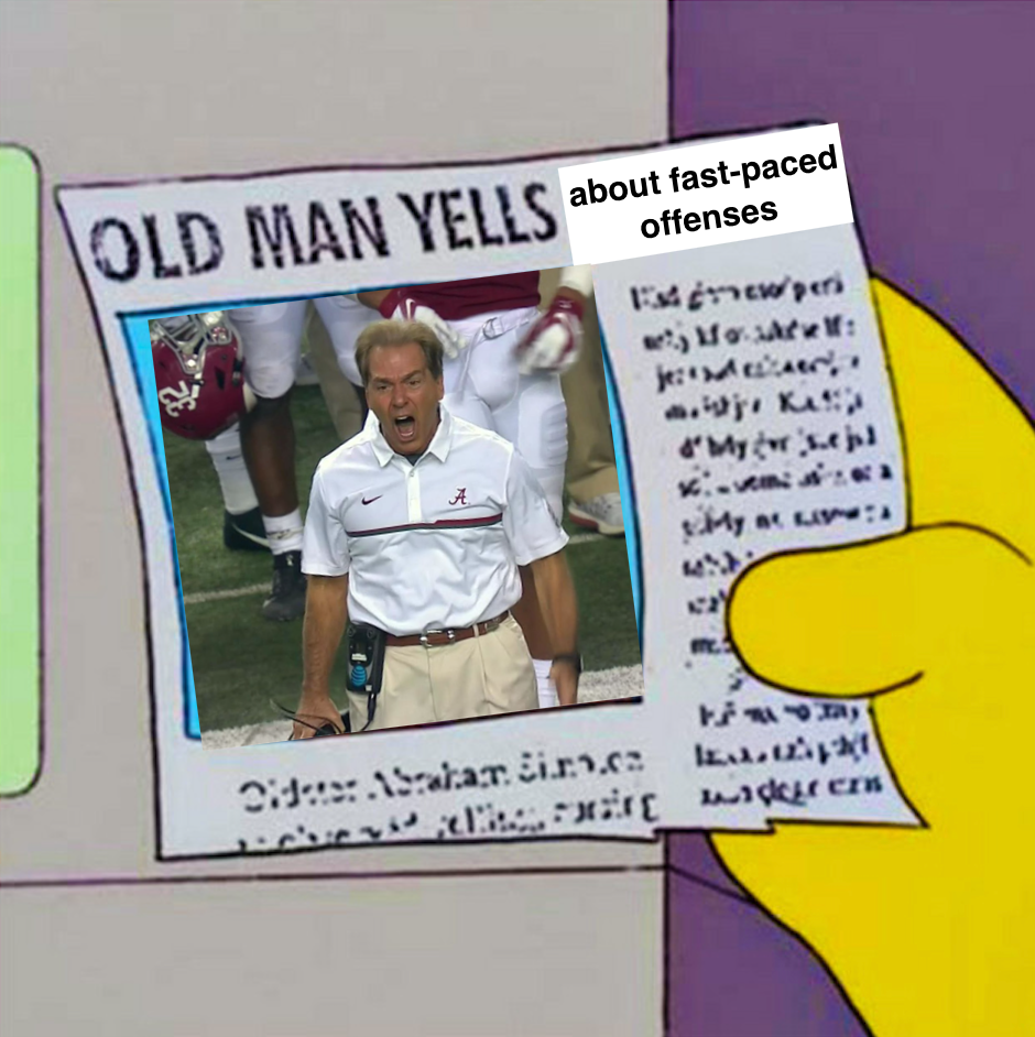 It wouldn't surprise me in the slightest if the Tiny Tyrant eventually gets his way on this. The SEC and the NCAA bow constantly to Saban so perhaps they'll implement some nonsense that slows down offenses such as Josh Heuepl's. But until that day comes, I'll just leave you with this very stupid meme I made and we can all point and laugh at this angry old man as he yells at the clouds…